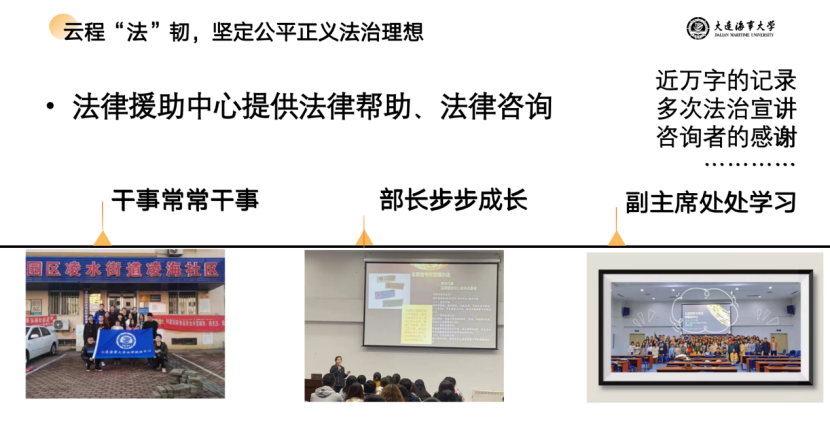 在法律援助中心时,她组织了法律文化节、宪法日、法律文书等多项活动,参与了凌水街道等地方的普法宣传活动,更是在疫情期间通过线上征集为咨询者提供法律咨询服务,帮助中心获得校级优秀社团的荣誉称号。