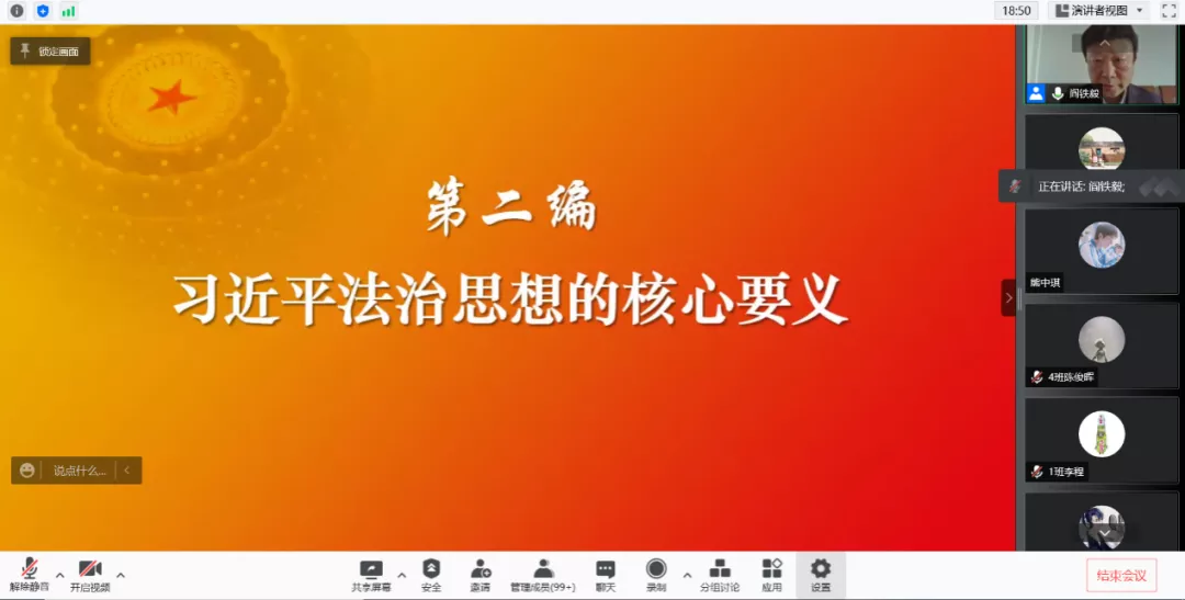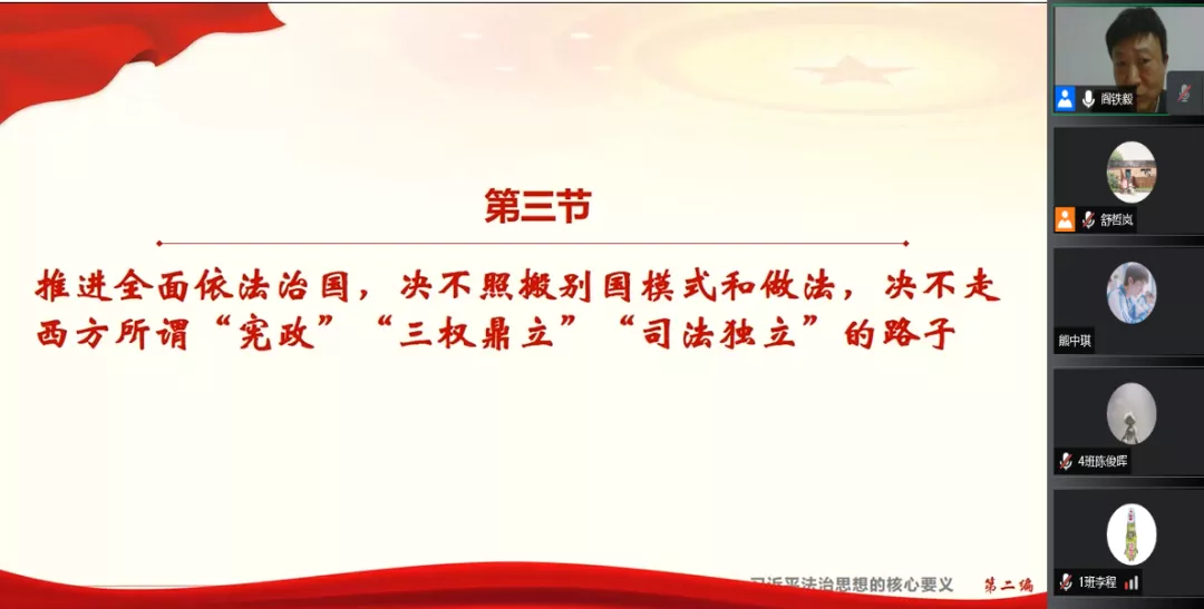 阎铁毅教授进行了第七章“坚持中国特色社会主义法治道路”的讲授。他先以一段生动的视频,引导同学们回顾了疫情一年多以来国内外社会情况的对比,结合十九届四中全会“十三个方面的显著优势”的内容,逐一讲解了中国特色社会主义法治道路的三个核心要义,必须坚持的根本制度、基本制度、重要制度,加深了同学们对“四善于”“四个伟大”“五个认同”等问题的认识。阎铁毅教授从性质、由来、体系、创新四个方面概括贯彻中国特色社会主义法治理论,并从三大方面阐述了坚持党的领导、人民当家作主、依法治国三者有机统一。在回顾党对法治道路探索历史时,他结合《刘巧儿》评剧介绍了马锡五审判方式、枫桥经验,举例生态环境法律问题来强调社会规范的重要性,用云南省邓兴法官背国徽组巡回法庭的事迹说明新16字方针。阎铁毅教授还就传承中华优秀法律文化、借鉴国外法治有益成果,阐述了应如何探索法治道路,并说明推进全面依法治国决不照搬别国模式和做法,决不走西方所谓“宪政”“三权鼎立”“司法独立”的路子。
