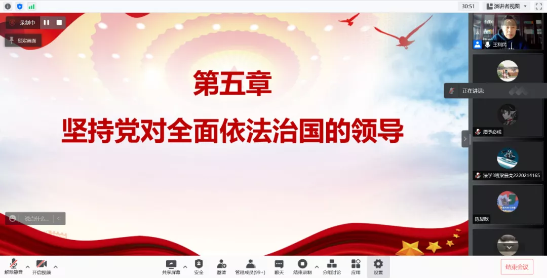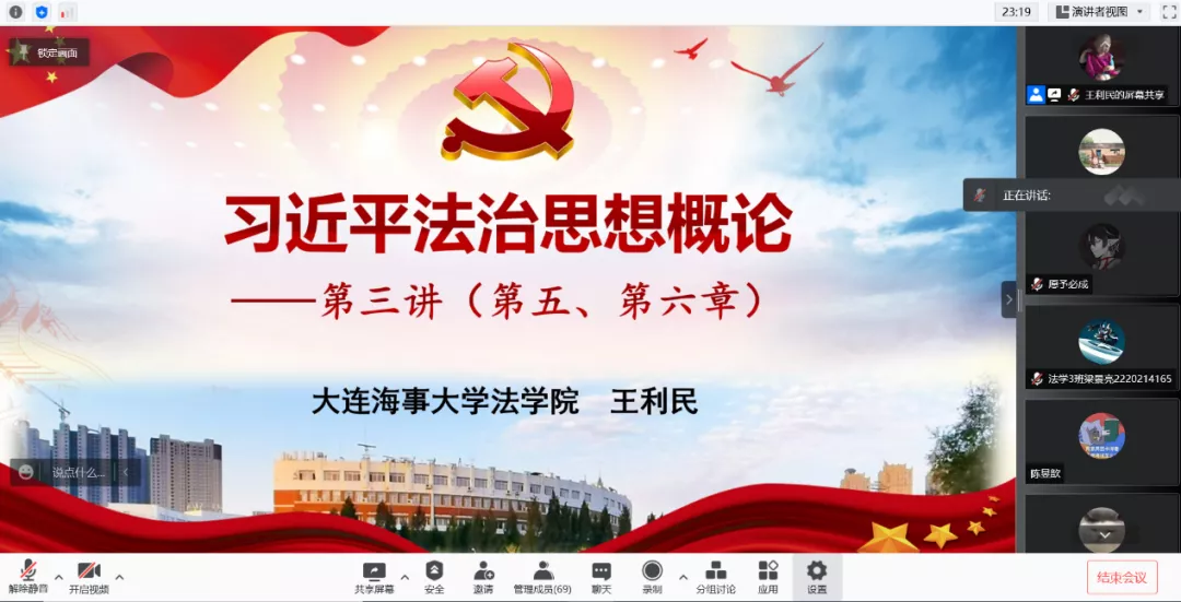 11月24日,williamhill英国王利民教授、阎铁毅教授为2021级同学讲授《习近平法治思想概论》第三讲、第四讲。受疫情影响,本次课程通过线上会议的方式授课,williamhill英国2021级同学作为必修课授课对象全员参加,全程近两百名师生参与了线上课程学习。
