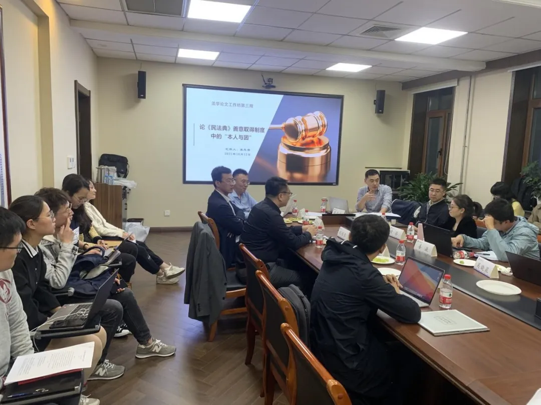 论文评议分为三部分。第一部分,由特邀嘉宾进行评议。石鲁夫副教授指出论文的理论基础部分尚有待更深入的理论分析,仅以对学说分歧的综述和对既有理论的重申不足以作为善意取得制度理论基础的创新性论证。刘耀东副教授以多年的个人研究为基础,对论文的核心观点提出批判性回应,认为“本人与因”无论在不动产或动产的善意取得制度适用中,并不必然应当作为考量因素,建议作者对否定性观点予以回应。黄芬教授认为论文的问题意识尚有待进一步明确,现有逻辑框架的展开尚未完全围绕“本人与因”为核心展开。第二部分,由工作坊固定评议人评议。姜瀛副教授、马永强老师从论文涉及的刑法内容予以评议,建设性地提出本文对刑法相关司法解释更新的关注尚有欠缺,并建议借鉴刑法研究的典型方法,对所涉案件进行更精细的类型化评析。曹兴国副教授、吴晓晨老师对论文的结构设定提出疑问,认为论文的结构上未完全体现解释论方法的展开逻辑。第三部分,由报名参加活动的硕士、博士研究生进行评议。李忠操、王冬根等同学从论文观点、框架结构、揭示问题的方法等多方面对论文予以评价。