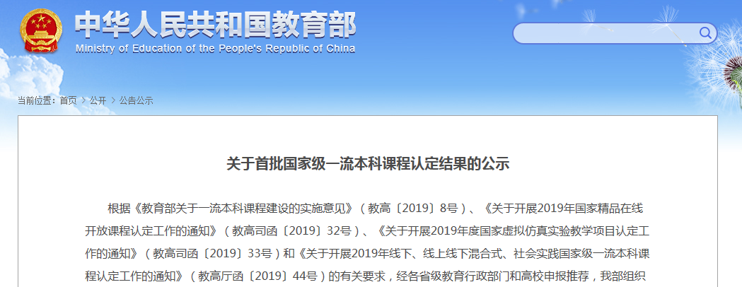 2019年11月,教育部实施一流本科课程“双万计划”,认定万门左右国家级一流本科课程和万门左右省级一流本科课程。国家级一流本科课程建设从教学理念、教学成果、课程目标、教学设计、课程内容、教学组织、课程管理等多方面、多维度对课程进行筛选和评价,一流本科课程认定结果代表了现阶段本科课程的最高水平。