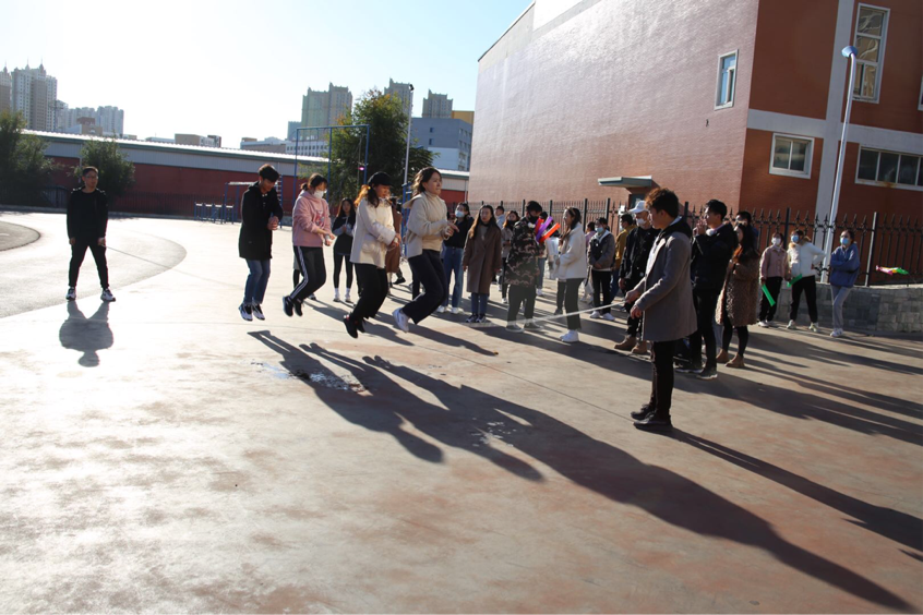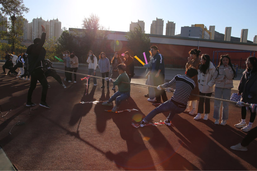 最后压轴比赛是“多人拔河”比赛。同学们凭借个人实力和团队合作奋力将长绳拉向己方,正可谓是一绳遒劲落阵中,两队拼搏站如松,三声口号气势出,四战捷报笑脸红。场外同学们的加油声将比赛的氛围推向高潮,经历了一番胶着比赛后最终分出了胜负。大家拼尽全力参加,并肩蹬地再紧握,输赢何妨满笑声。