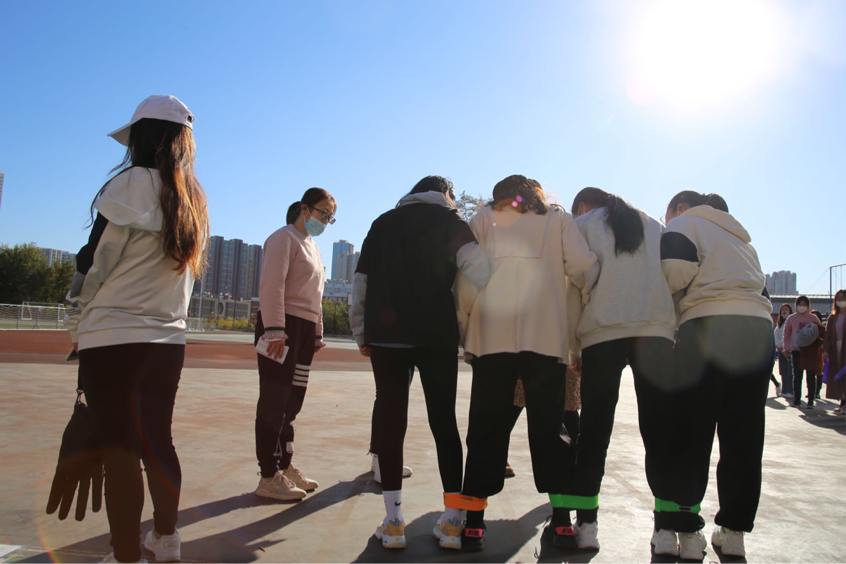 接下来进行的项目是“多人多足竞赛”。同学们四人一组手挽手、脚并脚喊着口号按着各自的节奏向前行,在配合中完成比赛。摔倒后站起来继续前行,给比赛增添了一番趣味。