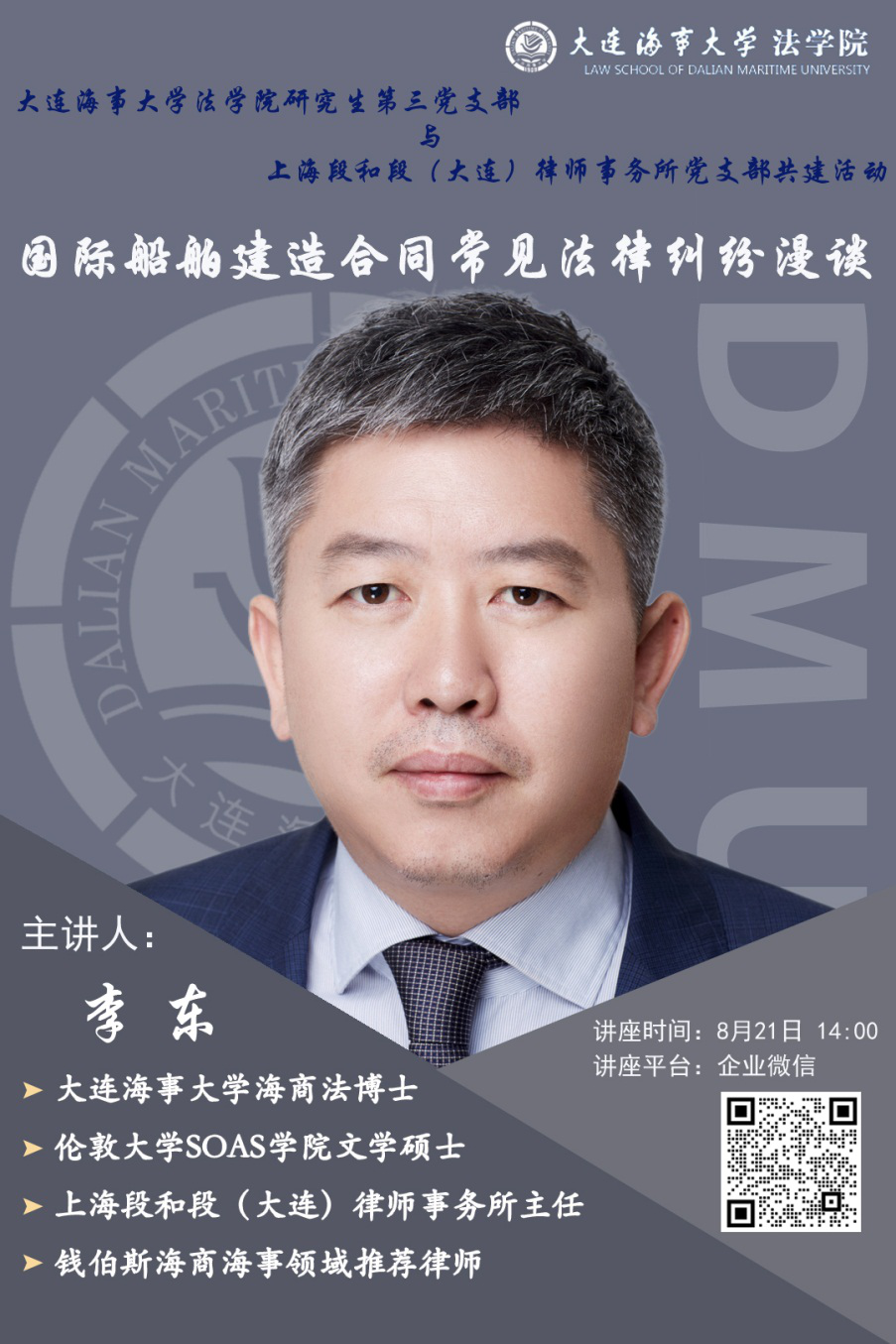 为进一步加强新形势下基层党组织建设,强化党组织之间的交流合作,实现双向互动、资源共享、共同提升,williamhill英国将于2020年8月21日14:00举行williamhill英国研究生第三党支部与上海段和段(大连)律师事务所党支部共建活动启动仪式暨“国际船舶建造合同常见法律纠纷漫谈”主题讲座,欢迎大家参加。