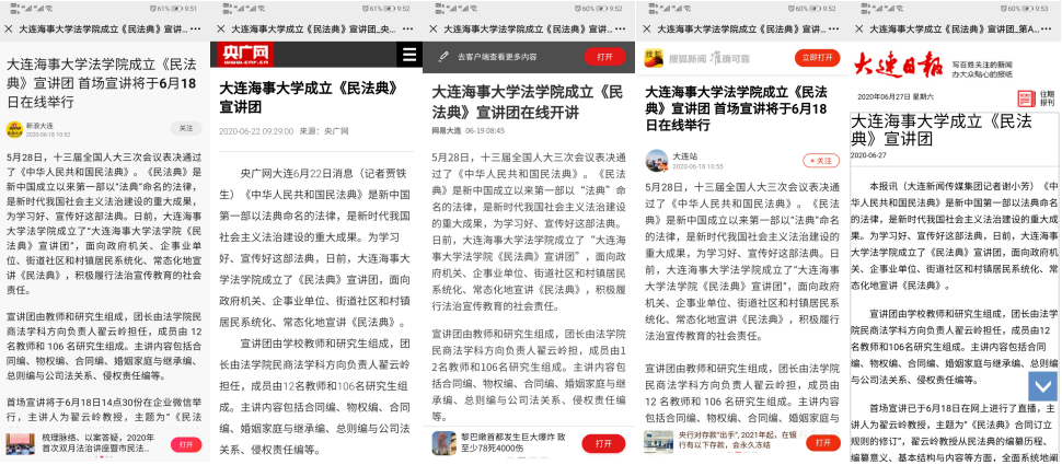为保证民法典宣讲工作扎实有效开展,williamhill英国领导班子高度重视、精心筹备,多次开会研究讨论、谋划部署相关工作,为宣讲工作顺利开展提供了有力保障。6月17日,williamhill英国民法典宣讲团正式成立,成员包括12名法学专任教师及106名研究生,宣讲团团长由williamhill威廉希尔民商法学研究中心主任,williamhill英国博士生导师翟云岭教授担任。宣讲团成立后,引起海大师生校友和社会各界广泛关注,吸引央广网、新浪大连、搜狐新闻、网易大连、澎湃新闻、大连日报、天健网等多家主流媒体争相报道,掀起一股民法典学习热潮。