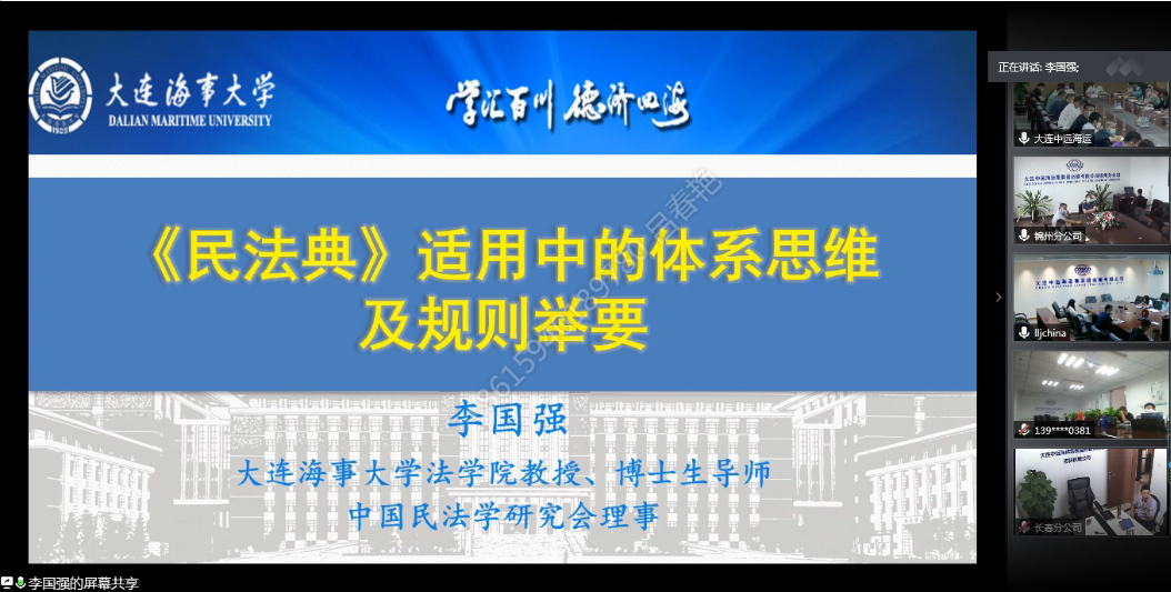 7月31日,李国强教授以“民法典适用中的体系思维及规则举要”为题,为大连中远海运集装箱运输有限公司及其分公司作民法典专题培训,讲座在大连主会场和八个分会场同步开展进行。李国强教授围绕“法律行为、合同”“用益物权、土地经营权”“违约责任”“未成年、成年监护”“民事责任”“典型合同”等几方面内容对民法典进行了全面细致的解读,为企业员工理解民法典、运用民法典提供了有益帮助。