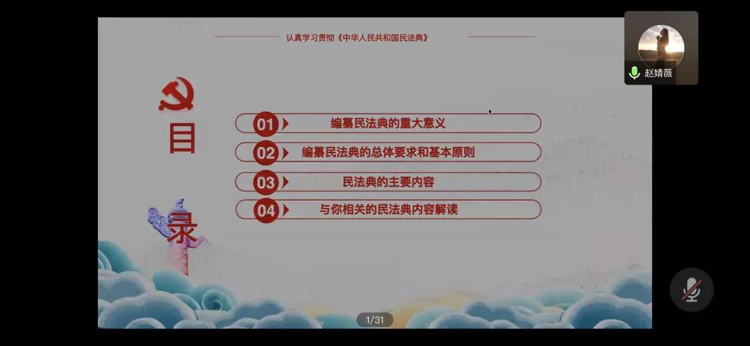 在接下来的培训课程中,赵婧薇以“编纂《民法典》的重大意义”、“编纂民法典的总体要求和基本原则”、“民法典的主要内容”、“与你相关的民法典内容解读”四个主题为重点,带领大家一起学习了相关内容,同时深入浅出地为大家讲解了如何进行宣讲、宣讲的重要意义以及注意事项等,尤其提到了宣讲的内容要根据自己所面对的受众进行调整,并结合具体案例进行分析与解读。