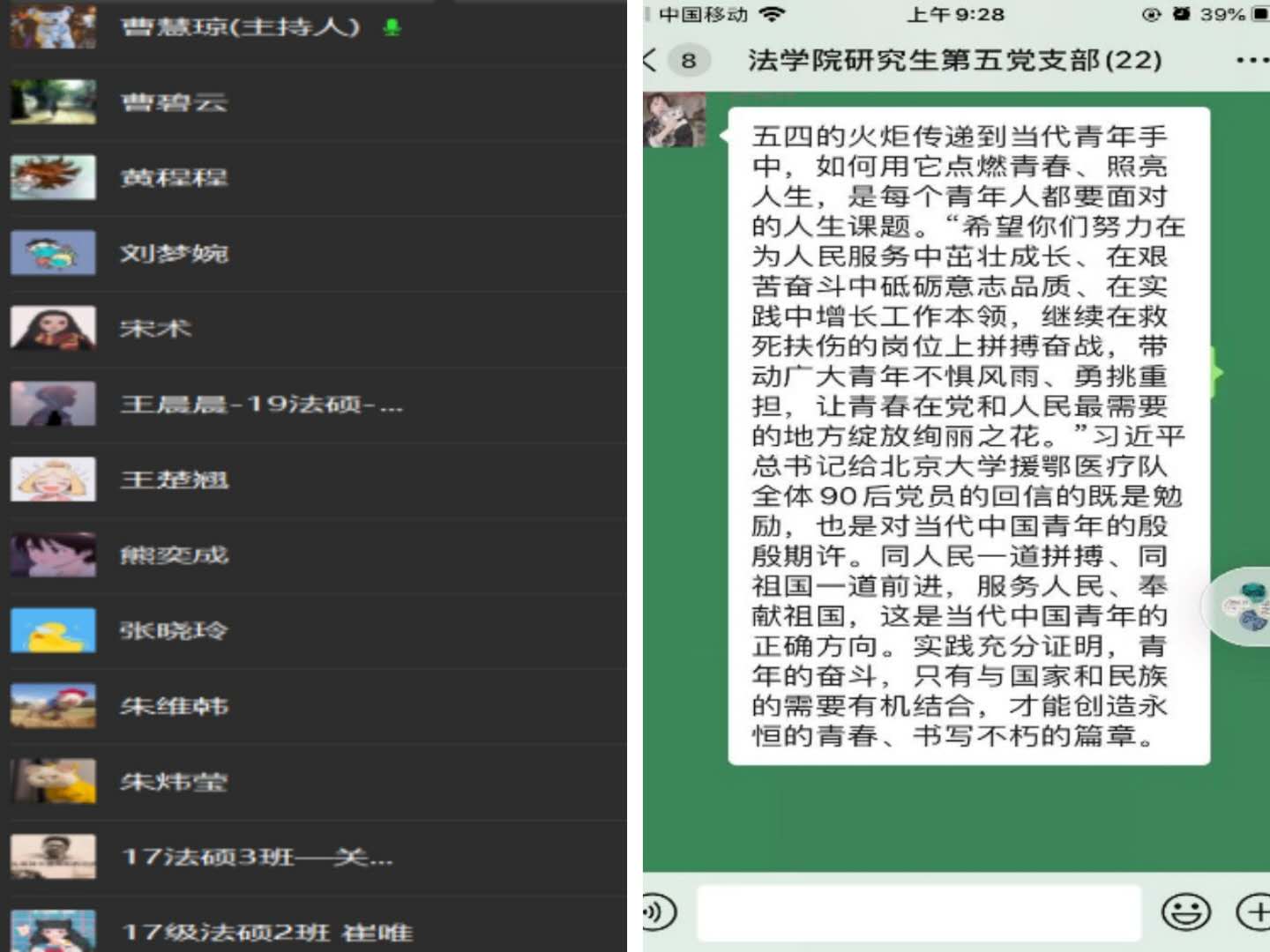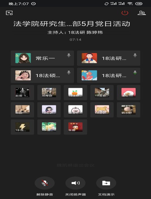 5月13日晚上,研究生第五党支部通过企业微信开展了主题为“弘扬五四精神 不负青春使命”的固定党日活动,会议由党支书曹慧琼主持,支委会全体成员及大部分党员参加了会议。本次会议共有三项议程:一是学习“习近平总书记给援鄂医疗队全体90后党员的回信”并谈感悟;二是学习学校相关通知并落实近期布置的“两优一先”推荐工作和预备党员线上考试工作;三是对支部党员履行党员义务、按时缴纳党费等要求加以强调。支部书记曹慧琼表示,支部将持续开展主题鲜明、内容丰富的主题党日活动,通过集体学习能够使各位党员进一步提高党性修养,加强组织的凝聚力。