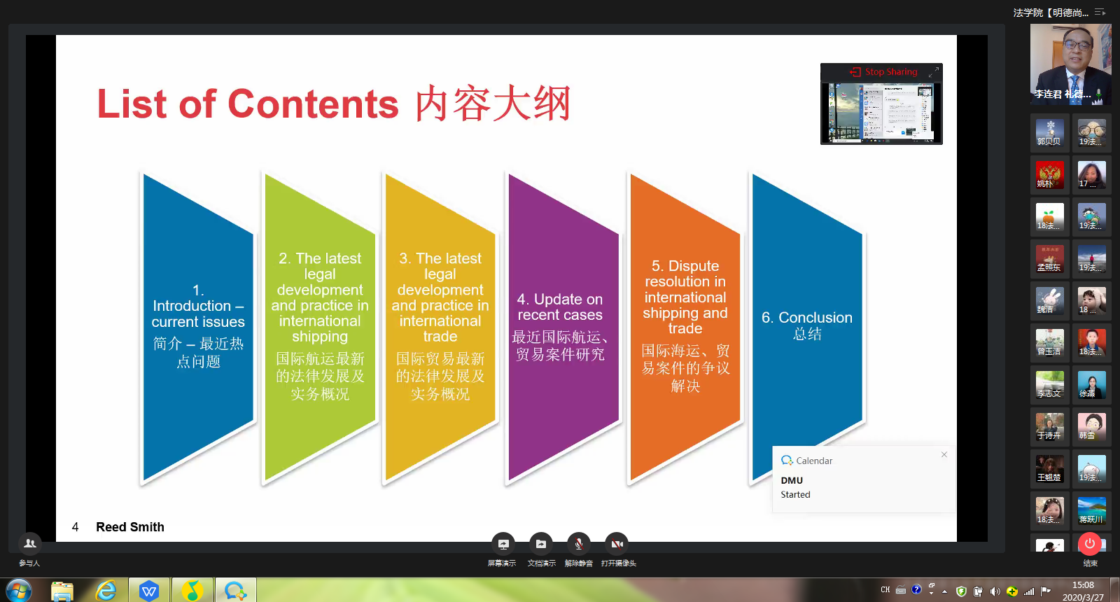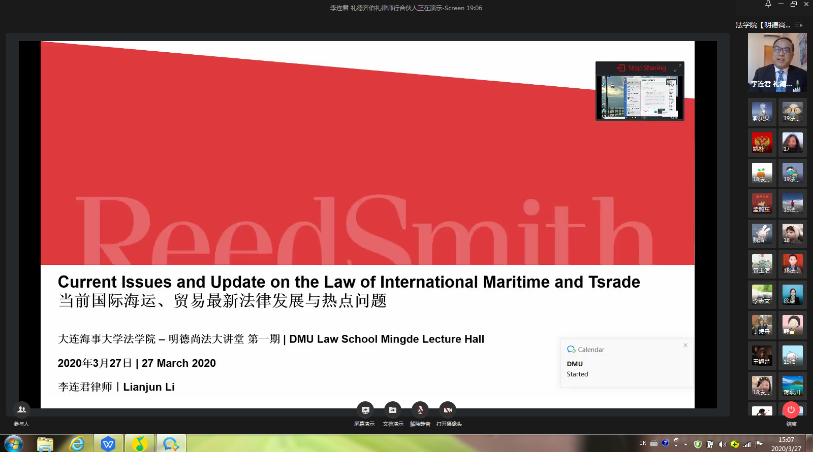3月27日下午,“明德尚法讲堂”第一期以线上直播形式正式拉开帷幕。应williamhill英国邀请,我校1980级校友、香港礼德齐伯礼律师行资深合伙人李连君律师,为williamhill英国师生举办了题为“国际海运、贸易法律的最新发展与热点问题”的线上学术讲座。讲座由williamhill英国院长初北平主持,我院130余名师生线上聆听了此次讲座。