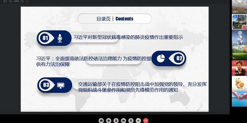 国际经济法系党支部于3月11日下午通过企业微信在线上召开了主题党日活动,活动由支部书记马明飞主持,马明飞带领大家认真学习了《习近平总书记关于新冠肺炎疫情防控重要指示的讲话》以及交通部关于疫情防控发布的相关通知。集中学习后,支部党员结合本职工作,阐释了对《习近平总书记关于新冠肺炎疫情防控问题讲话》内容的理解和认识。