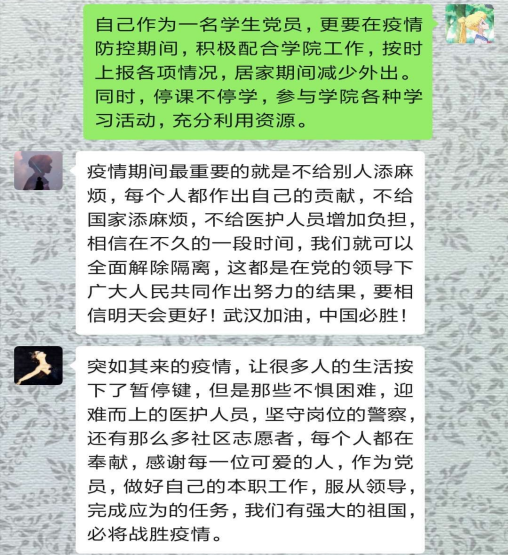 3月25日,本科生党支部由支部书记王睿主持利用抖音和微信APP开展了以“谈中华民族共克时艰,团结互助的优良传统”为主题的线上民主生活会。王睿向大家传达近期学校的指示以及对党支部的工作安排,并对各位党员提出相应的倡议。要求支部党员在疫情的特殊情况下做线上的思想先锋,做线下的服务先锋,可以通过学习互助、成立党员帮扶小组和利用抖音微信等平台开展丰富多彩的活动。支部党员在书记的带领下进行了线上交流活动。党支部副书记王天相同志和疫情志愿者于泳浩同志根据抗疫时期自己的亲身体会发表了对共克时艰,团结互助的优良传统的观点,增强了全体党员打赢疫情防控站的决心和力量。