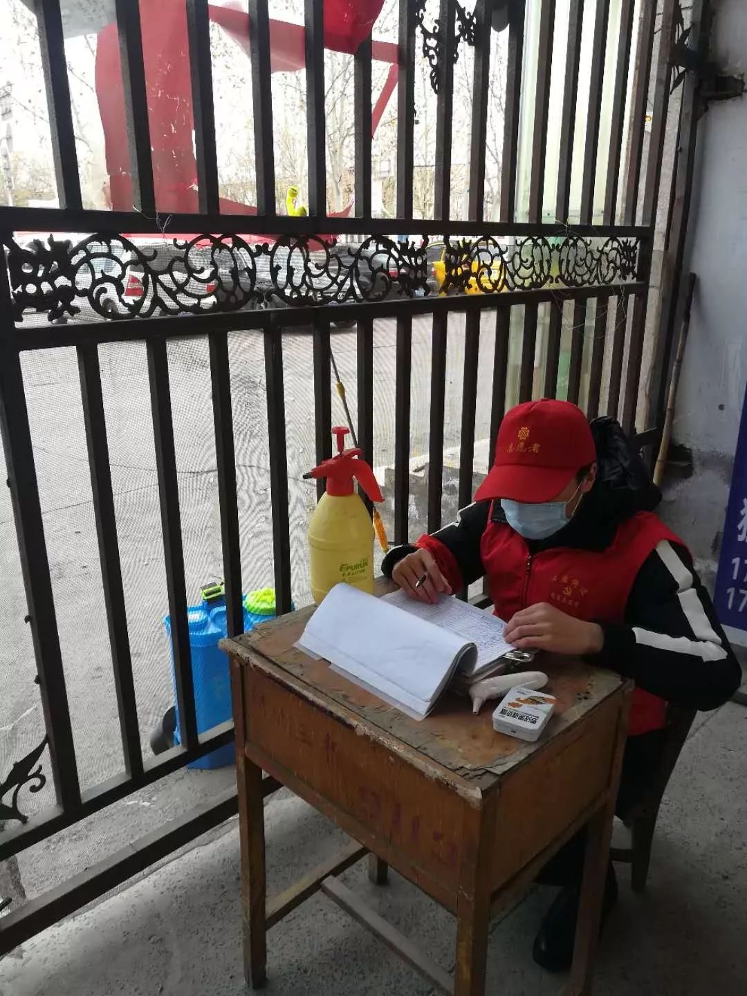 在河南济源市,2018级研究生冯思嘉同学,疫情一开始就在社区的号召下,开始本小区的志愿防控工作。在前几天展开人员出入的登记、查控体温、消毒液的喷洒等。
