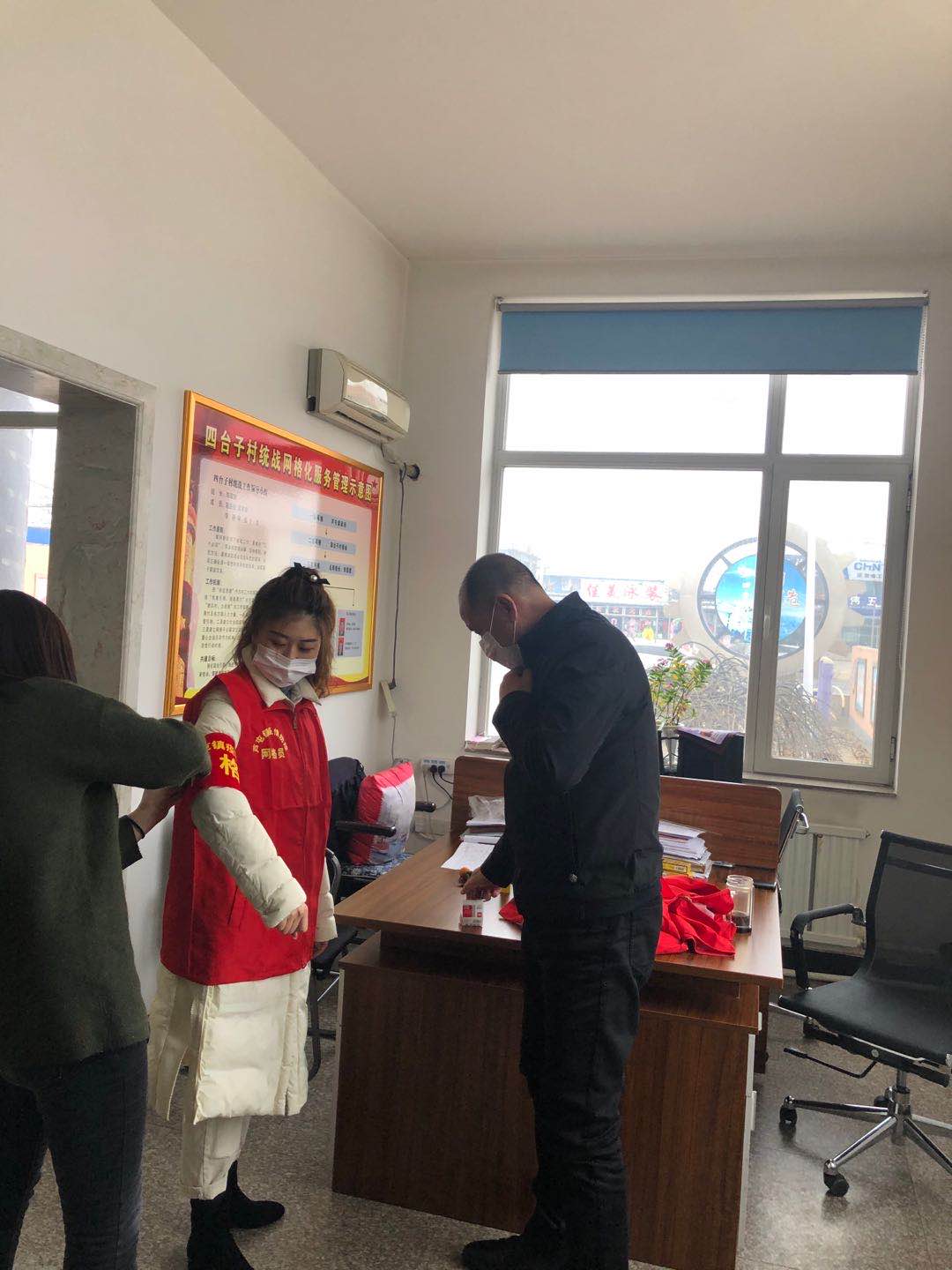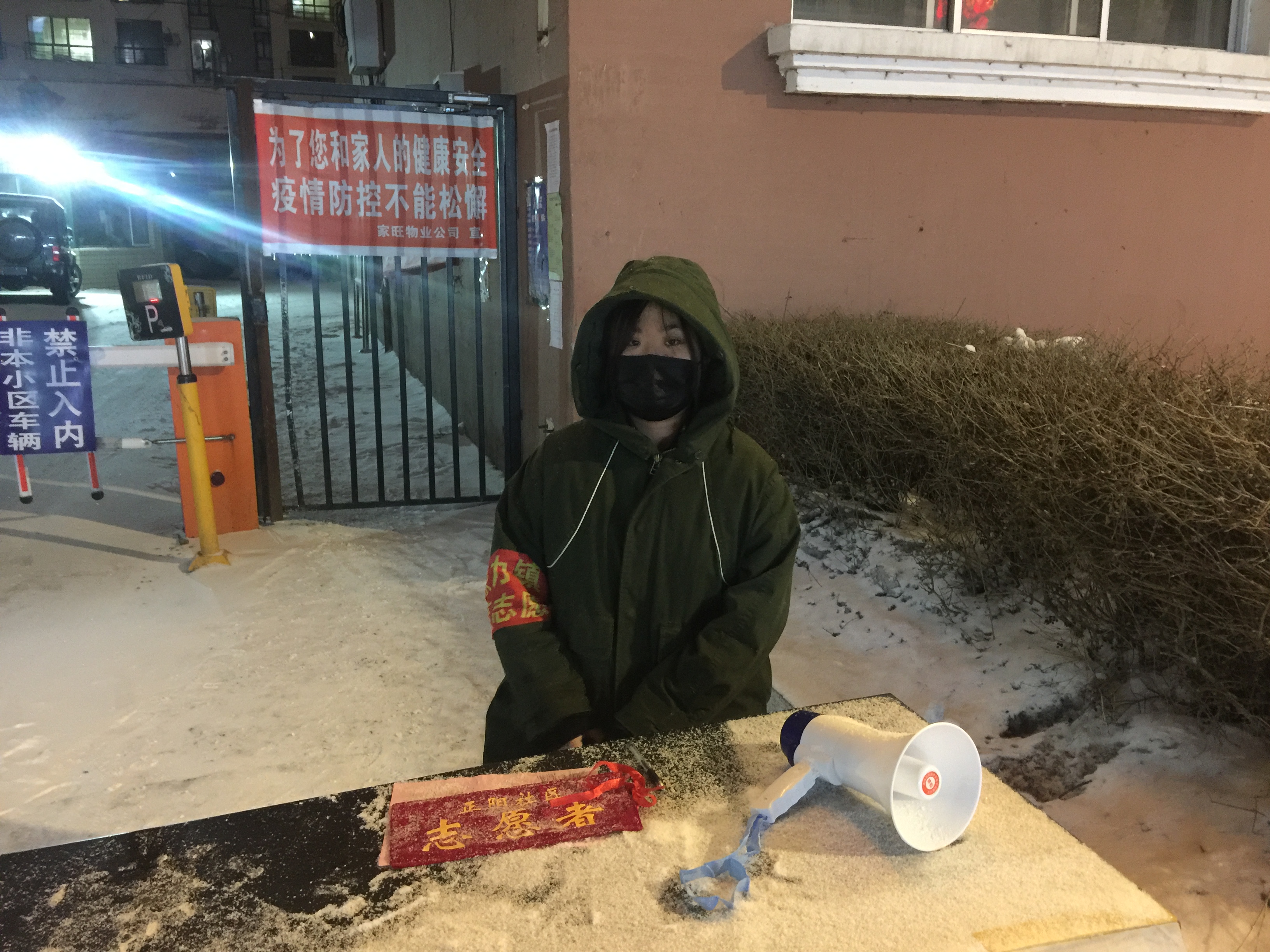 在黑龙江省伊春市铁力市年丰乡长山村,2019级本科生沈卓然同学在卡口协助社区工作,负责记录村内居民及车辆外出,对进村车辆人员进行排查,进村入户调查是否有返乡人员及有无特殊身体状况反应,帮助全村居民排查疫情隐患。