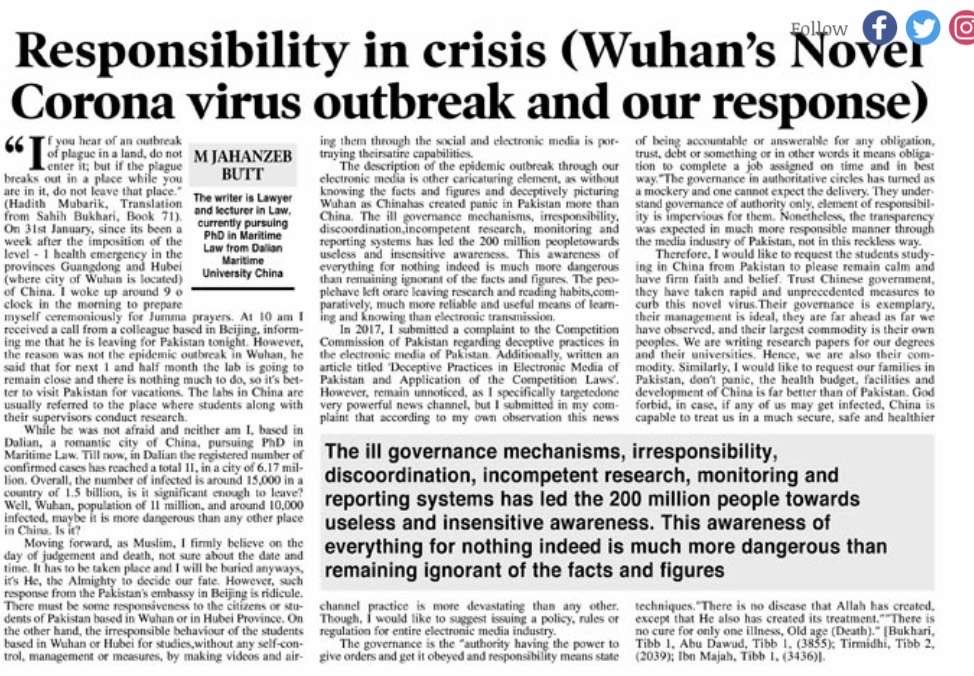 On February 3, Mr. M Jahanzeb Butt, a doctoral student from Pakistan studying at the Law School of Dalian Maritime University, published an article titled "Responsibility Under Crisis" on Daily Times, a well-known English newspaper in Pakistan, calling on all Pakistani students studying in China to remain calm in the face of the Coronavirus, and believe in the governance capacity and response measures of the Chinese government and that the Chinese government will pay attention to the health of all international students studying in China as it values its own citizens.