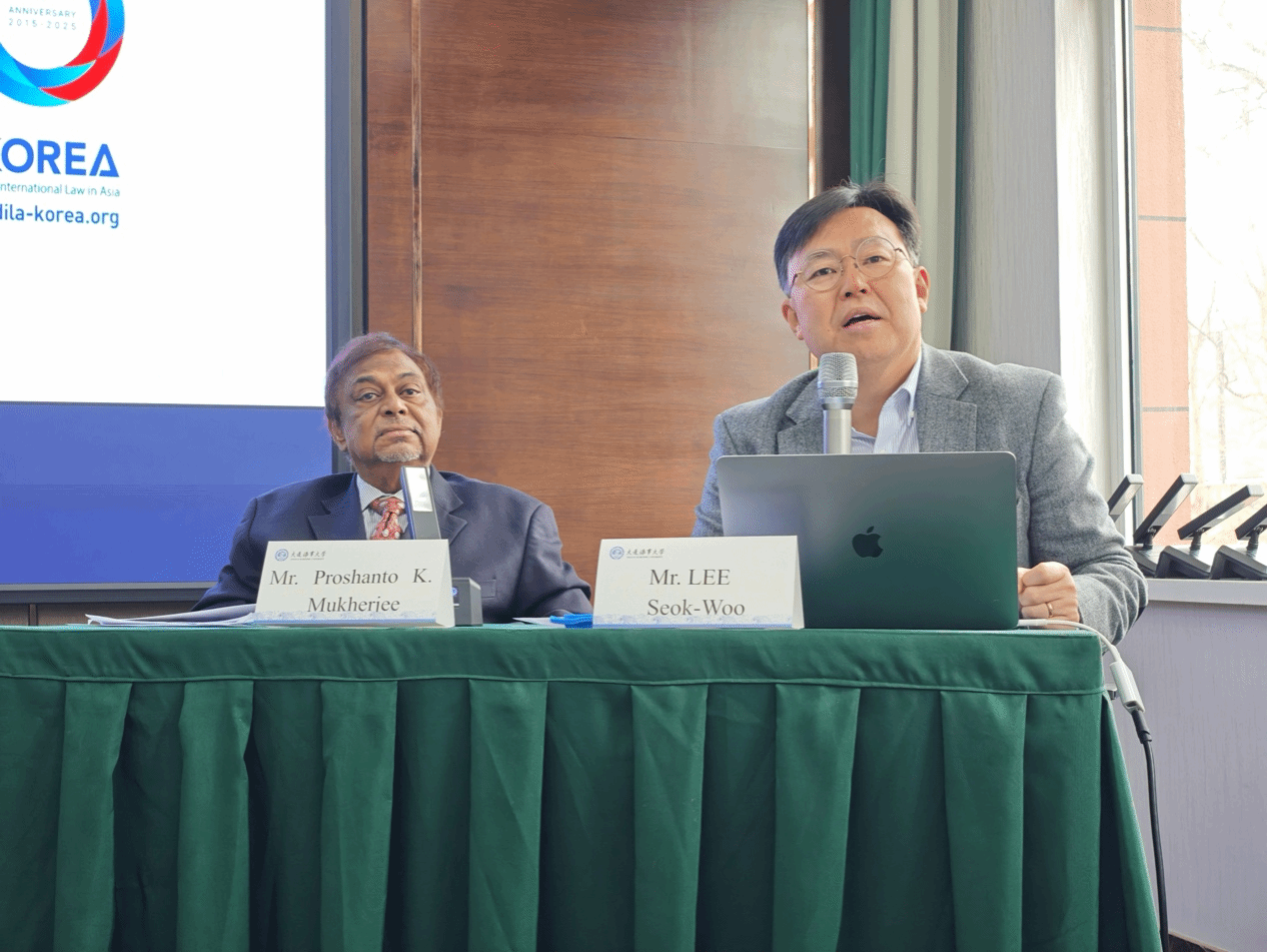 Proshanto K. Mukherjee教授主持了“海洋法及海洋政策”这一议题下的发言。Seokwoo LEE教授及亚洲-韩国国际法发展基金会Tae-Gil KIM秘书长发表了题为《Law Enforcement at Sea: Current Issues related to Blocking Illegal Export of Strategic Materials through the Sea》的报告,潘晓琳副教授发表了题为《China’s Marine Environmental Law Enforcement against Nuclear Contaminated Water Discharge of Japan》的报告,williamhill威廉希尔博士研究生段星伊发表了题为《Research on the Application of International Investment Agreements to Foreign Investment in Different Maritime Zones》的报告,williamhill威廉希尔博士研究生赵晓楠发表了题为《A Discussion about the ITLOS Advisory Opinion on Climate Change and Response from Asia》的报告。