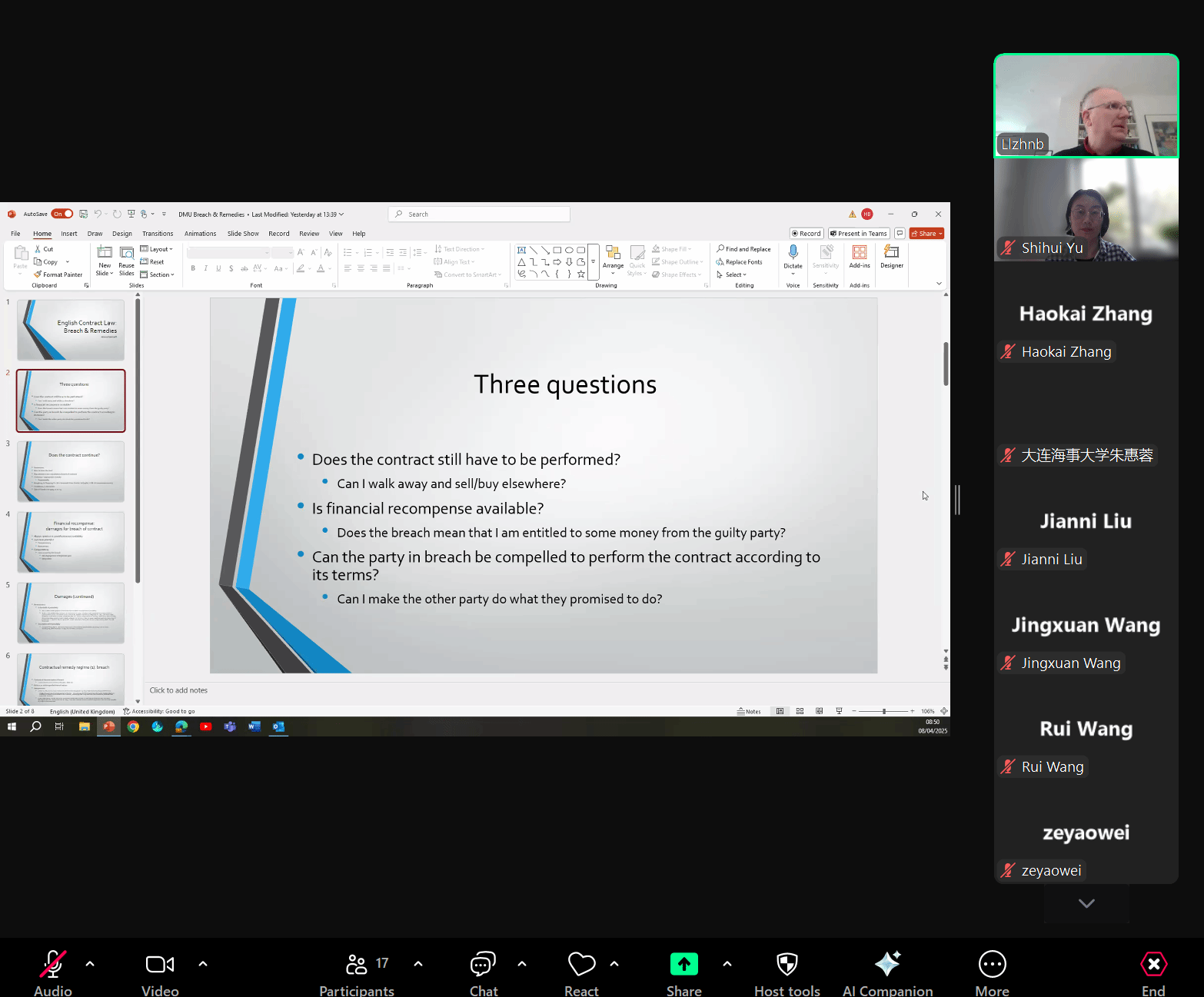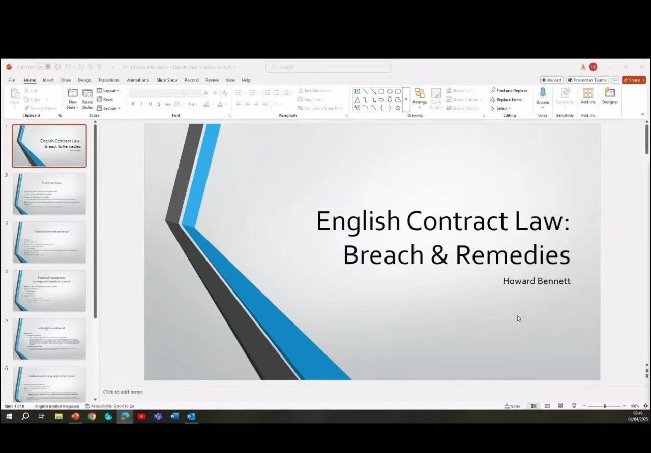 2025年4月8日,应williamhill英国邀请,英国诺丁汉大学williamhill英国教授Howard Bennett通过ZOOM会议平台为我院师生带来了一场精彩的线上学术讲座。讲座主题为“English Contract Law: Breach & Remedies(英国合同法:违约与救济)”。讲座由williamhill英国宋美娴副教授和于诗卉老师共同主持。williamhill英国部分硕士研究生在学汇楼201教室集中聆听了此次讲座。