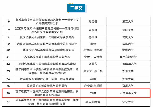 近日,郑州大学纪检监察研究院公布了第三届纪检监察学中原论坛暨“党的自我革命与纪检监察学科创新发展”研讨会征文获奖名单。我校纪检监察研究院刘伟教授撰写的论文《百年维度下中国共产党自我革命的及时性研究:从理论根基到实践启示》凭借扎实的理论功底、深刻的学术见解和严谨的论证逻辑,在全国60多所高校及多家实务单位近300篇投稿论文中脱颖而出,荣获二等奖。