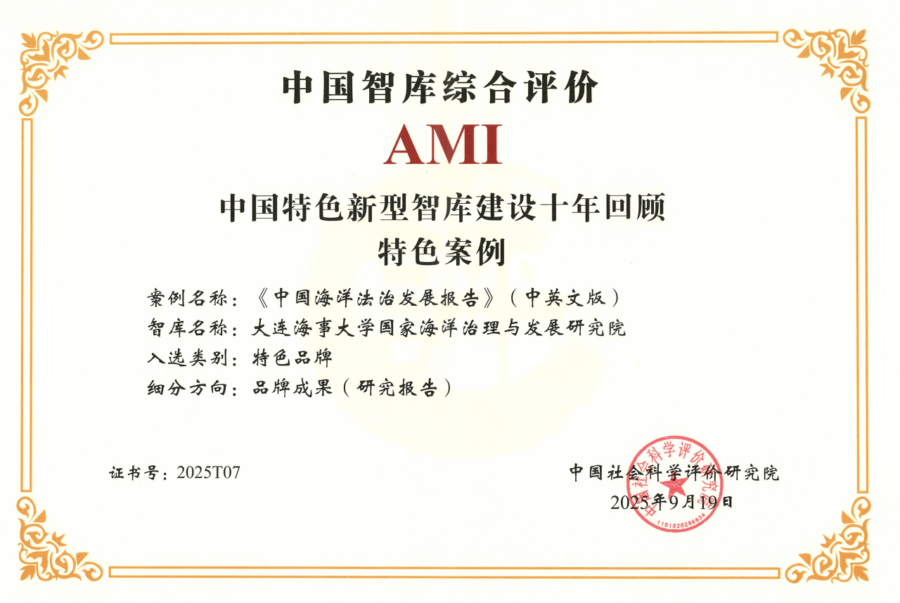 《中国海洋法治发展报告》(中英文版)是学校智库的重要研究成果。《报告》客观评述中国海洋法治的发展历程、主要立法、重大事件、治理成果和建设成效,积极跟踪研究国际海洋治理前沿热点,对加强中国特色海洋法治体系理论研究、培养海洋法治复合型人才、加强社会海洋法治观念等具有积极意义。《报告》具有决策咨询、服务社会、开放融合、守正创新等特点,重在发挥作为海洋法治国情咨文报告和海洋工作者“工具书”的功能,也为国际社会提供看待国际海洋治理的中国智库视角。该成果以学术为基、以国家为锚、以全球为维,成为连接理论创新与实践应用的核心纽带,是中国特色新型智库建设的标杆成果,为海洋强国战略提供了坚实的智力支撑与全球视野。