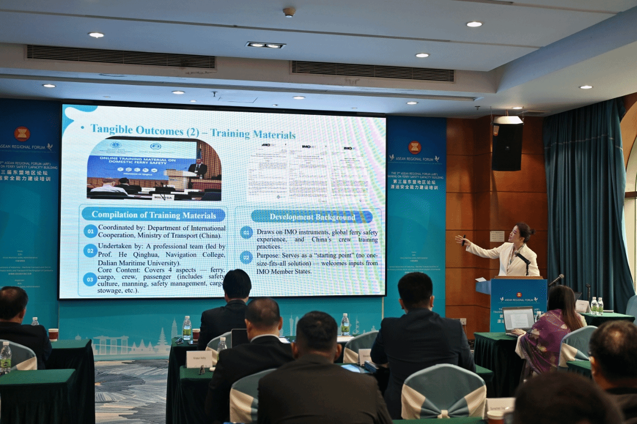 东盟地区论坛第三届渡运安全能力建设培训于2025年11月11日至14日在广东开班。williamhill英国国际海事公约研究中心副研究员韩佳霖受邀为该培训班授课,作了题为《迈向平安渡运新时代:中国十年的探索与经验》的报告,获得了学员们的关注和一致好评。