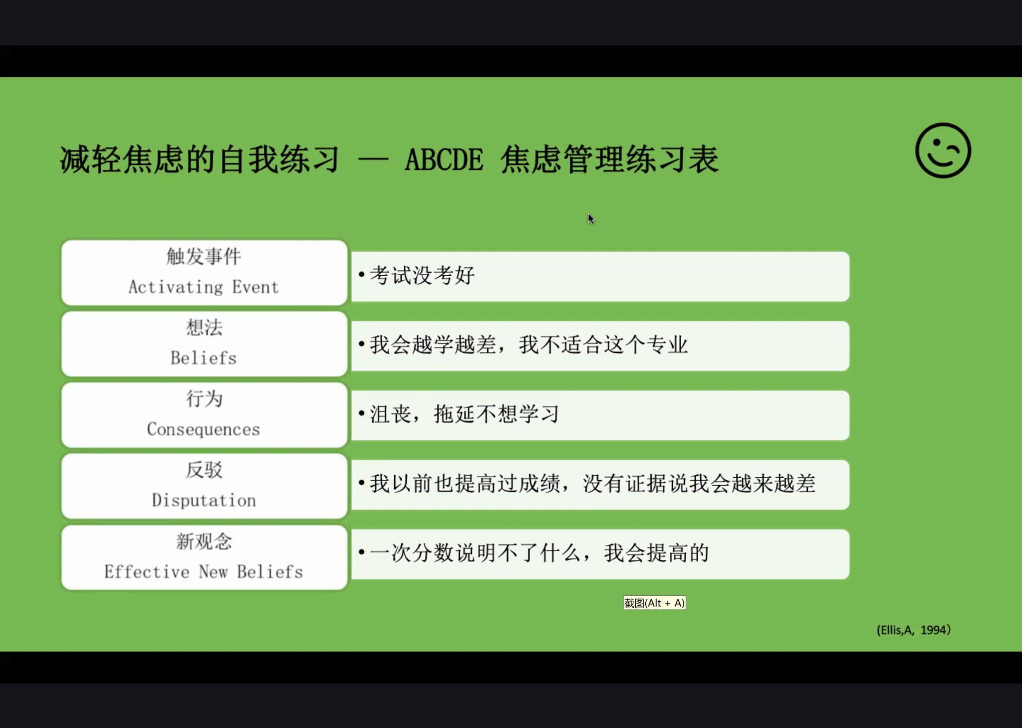 针对新生普遍存在的焦虑情绪,第二主题 “了解和控制你的焦虑感”,通过心理学与神经科学理论讲解,学生深入认识“焦虑”情绪,识别自身焦虑来源,并通过认知行为疗法(CBT)练习设计个性化应对策略。