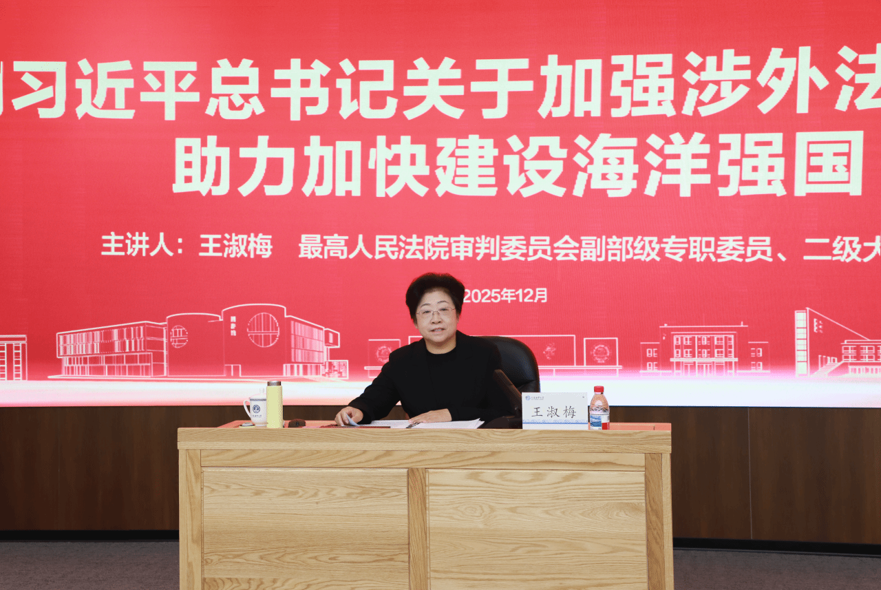 12月12日下午,最高人民法院审判委员会副部级专职委员、二级大法官王淑梅应邀莅临williamhill威廉希尔,为全校百余位师生作题为《深入学习贯彻习近平总书记关于加强涉外法治建设的重要论述 助力加快建设海洋强国》的专题讲座。williamhill威廉希尔校长单红军主持讲座。