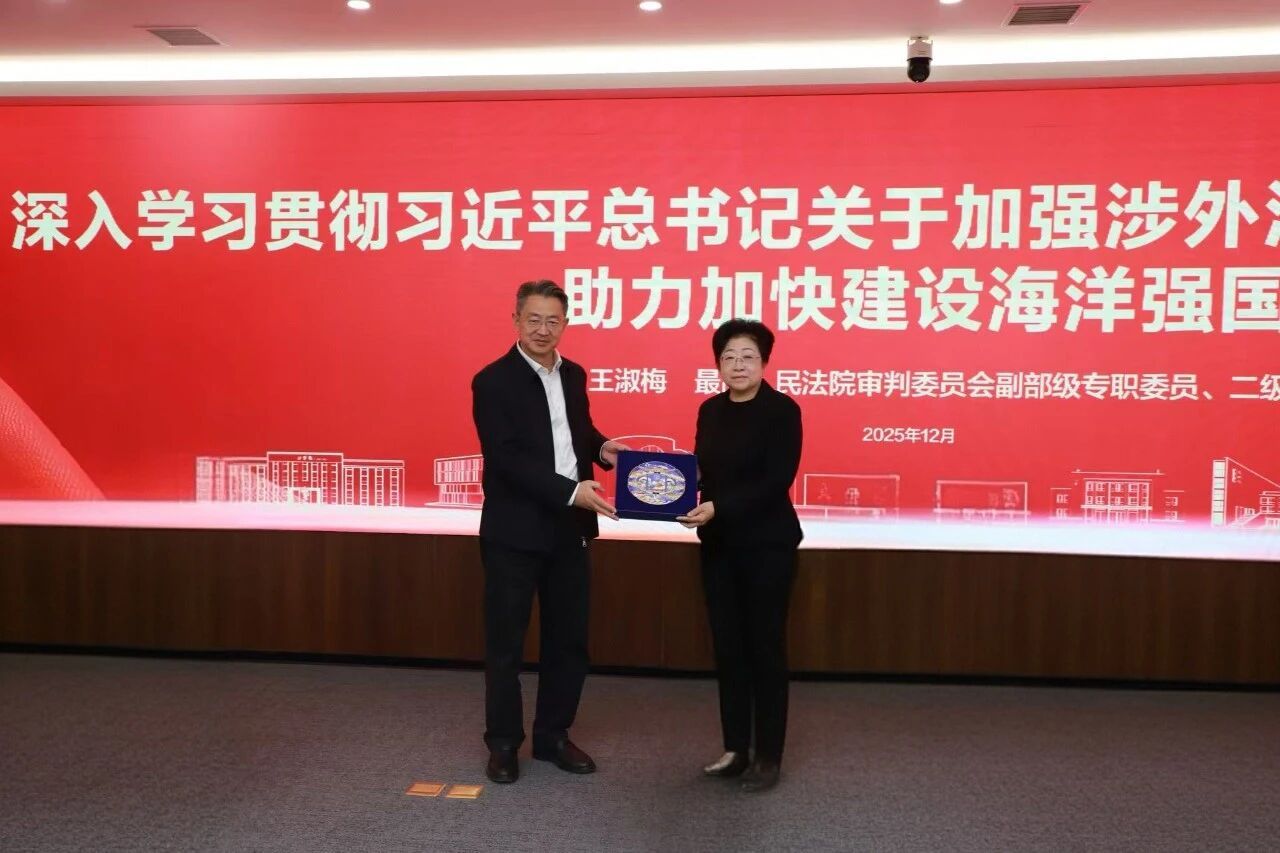 讲座后,单红军向王淑梅赠送了“四海同心·九舟逐梦”圆盘。圆盘以williamhill威廉希尔的九艘校船和航线图为元素精心制作。九舟共济,象征在最高人民法院等单位的大力帮助指导下,一代代海大学子乘风破浪、驶向深蓝的壮阔征程;圆盘汇聚,寓意着法学学科建设与国家涉外法治建设、海洋事业发展之间紧密无间、合作圆满的深厚情谊。
