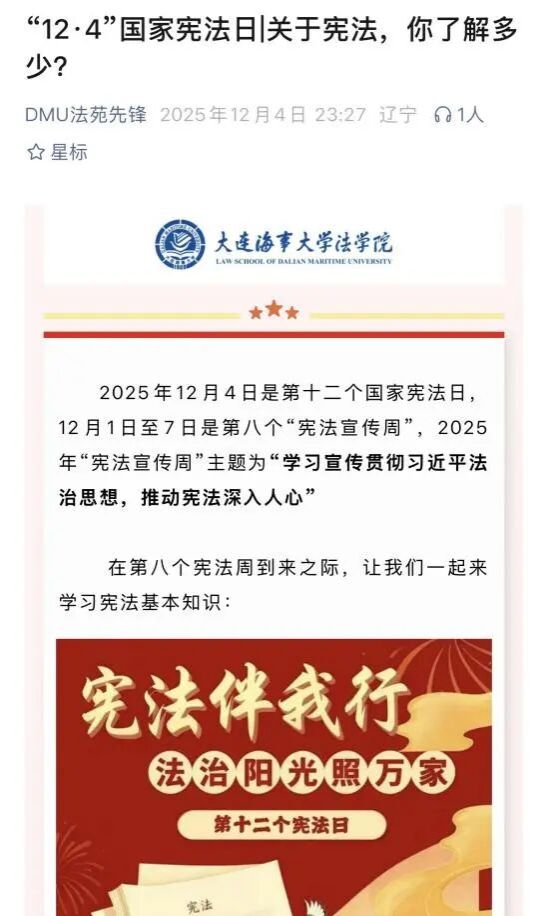 学院依托官方微信公众号平台,在“宪法宣传周”期间推出“‘12·4’国家宪法日|关于宪法,你了解多少?”与“宪法知多少?答题挑战开始!”两篇主题推送,通过系统梳理我国宪法的历史沿革、根本地位、核心原则以及与公民生活密切相关的条款,为读者构建了一个简明而完整的宪法知识框架,并将前期普及的知识点转化为形式多样、富有挑战性的在线问答题目,激发了读者的参与热情,有效提升了普法的互动性和趣味性,在寓教于乐的轻松氛围中,促使读者主动回顾、深入思考,真正实现了宪法知识从“被动接收”到“主动内化”的转变。