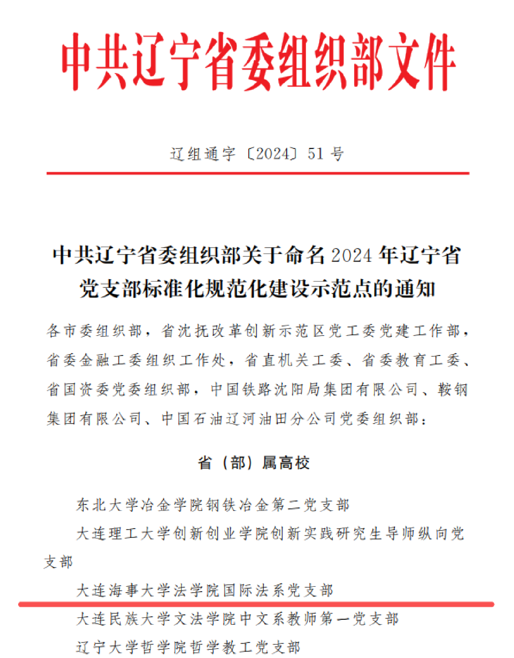 聚焦党建品牌提质增效。获评辽宁省党支部标准化规范化建设示范点1个、大连市法学会2024年青年普法志愿者法治文化基层行活动先进个人2人,推荐申报全国样板党支部2个、参评辽宁省党支部标准化规范化建设示范点1个、参评全国研究生党员标兵1名。国际法系党支部“强国行”成果受到全国高校思政工作网报道。