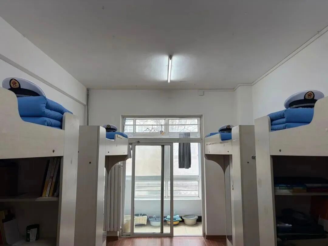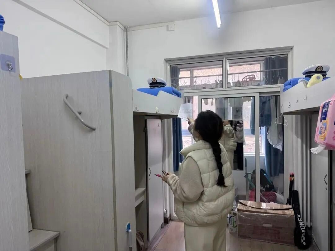 学院指导员进入宿舍检查电器设备,确保无违规电器使用,保障寝室安全,同时对寝室卫生条件进行检查与评比。
