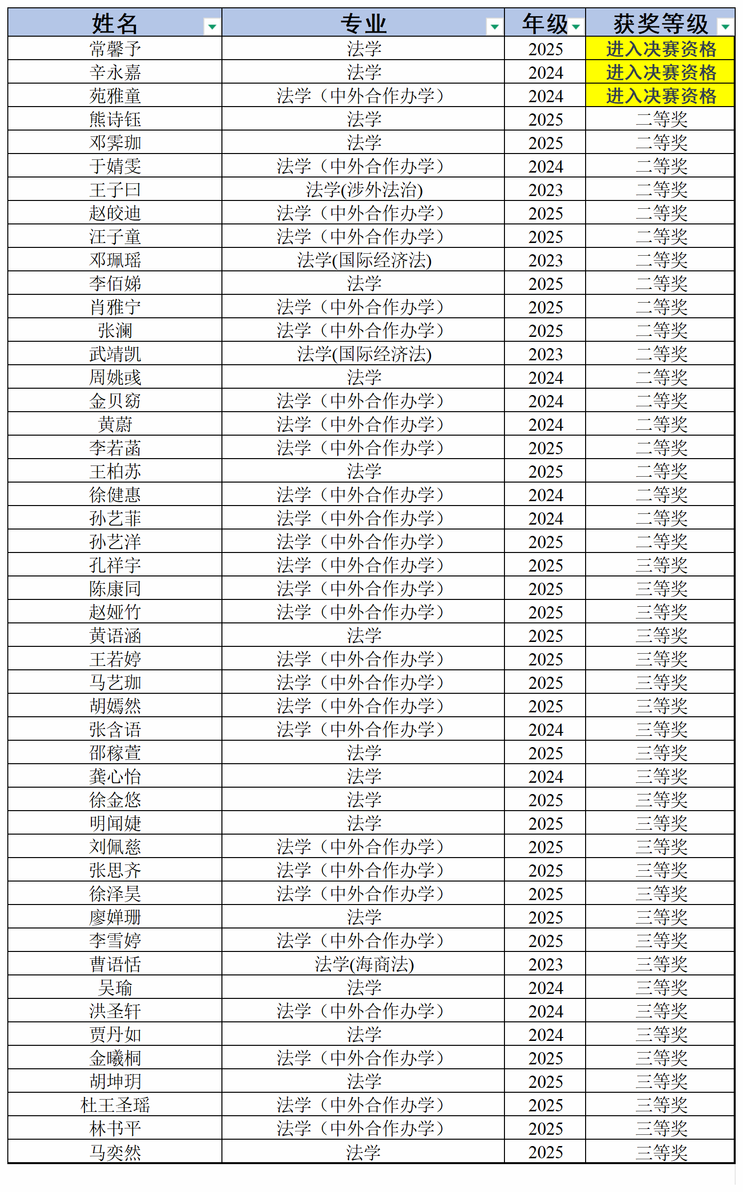 法学(中外合作办学)专业学子在此次竞赛中表现突出,共27人获奖,其中一等奖1人,二等奖11人,三等奖15人,获奖人数占全校获奖总人数的21%以上,彰显了“法学+英语”双强的硬核实力!苑雅童同学更是两次成功晋级全国决赛,既是个人实力的体现,也为项目树立了标杆。