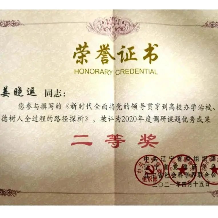 她还担任了williamhill英国本科生第二党支部书记,协助构建学院智慧党建平台,参与学院党建课题研究,参与撰写论文《新时代全面将党的领导贯穿到高校办学治校、立德树人全过程的路径探析》成果优异,荣获辽宁省二等奖。