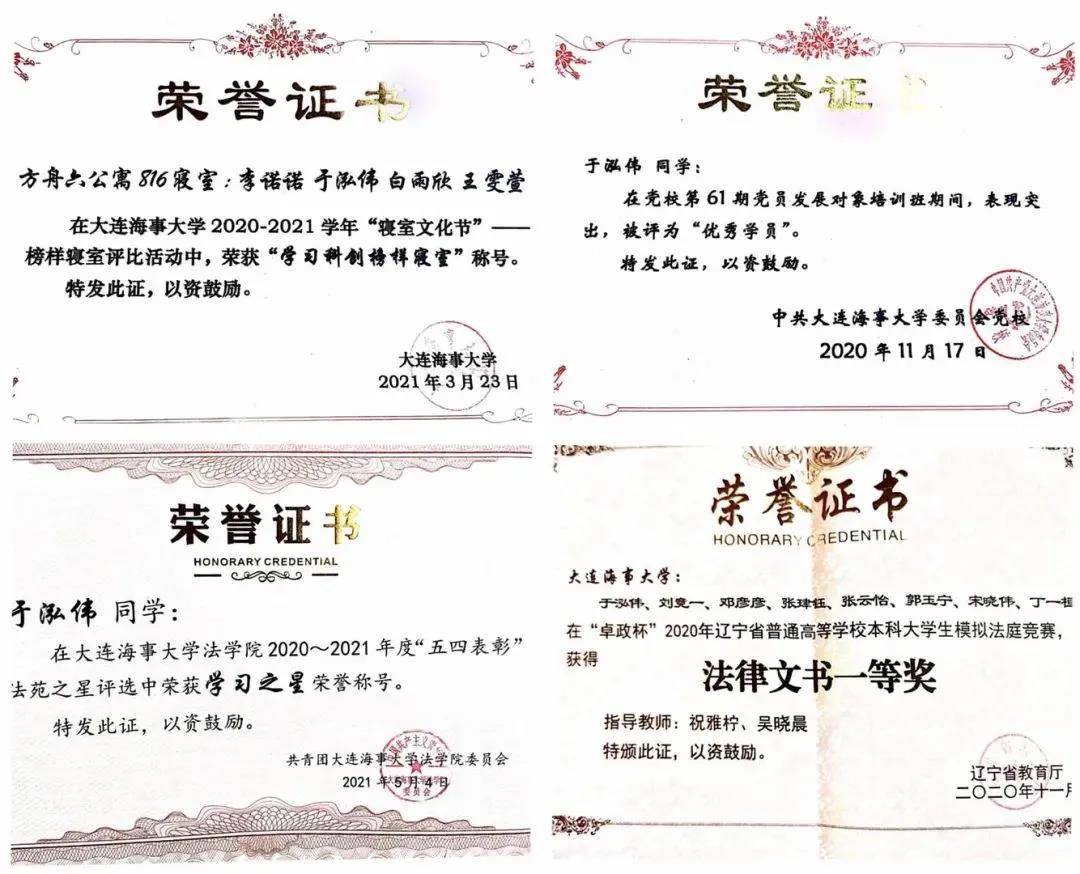 2020年,她参与辽宁省“卓政杯”普通高等学校本科大学生模拟法庭竞赛。竞赛期间,她直面挑战,出色地完成了搜索案例、撰写答辩书、上场比赛等多项任务,其所在团体获得辽宁省优秀文书一等奖的荣誉。她还曾荣获williamhill威廉希尔校级优秀团员、校级优秀学生干部、校级优秀学生、williamhill英国法苑之星 “学习之星”,曾获得中国银行一等奖学金、昕瞳沄謙奖学金。