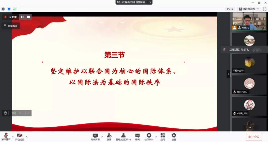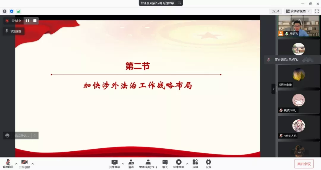 马明飞教授结合自身参与联合国会议的亲身经历,参照国内知名高校课程建设的经验,从立法、执法、法律服务体系等角度,向同学们讲解了加快涉外法治工作战略布局的重要性。他就自己长期深耕国际法领域的研究心得,列举了多个与国际公法、国际私法、国际经济法相关的典型案例,向同学们普及了联合国、WTO组织的成立背景、发展过程、运行机制,介绍了国际法的渊源构成、法则、基本准则等知识,讲到要坚定维护以联合国为核心的国际体系、以国际法为基础的国际秩序。马明飞教授还阐释了作为解决国际争端有效手段的和平共处五项原则、习近平总书记创造性地提出的“人类命运共同体”的理念,讲解中华民族传承和平、和睦、和谐。他通过为同学们解读“南海仲裁案”和“孟晚舟事件”,从四个方面说明如何提高我们的对外斗争能力,鼓励同学们努力学习国际法知识及熟练掌握外语,争当维护祖国利益的涉外法治人才。
