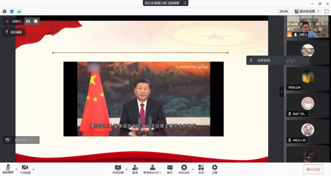 马明飞教授讲授第十三章“坚持统筹推进国内法治和涉外法治”。他为同学们播放了习近平总书记在“达沃斯论坛”讲话的视频,从中国共产党治国理政的原则、统筹推进国内和涉外法治的现实意义、二者的辩证关系三个方面,讲解了应统筹推进国内法治和涉外法治,更好地维护国家主权、安全和发展利益。