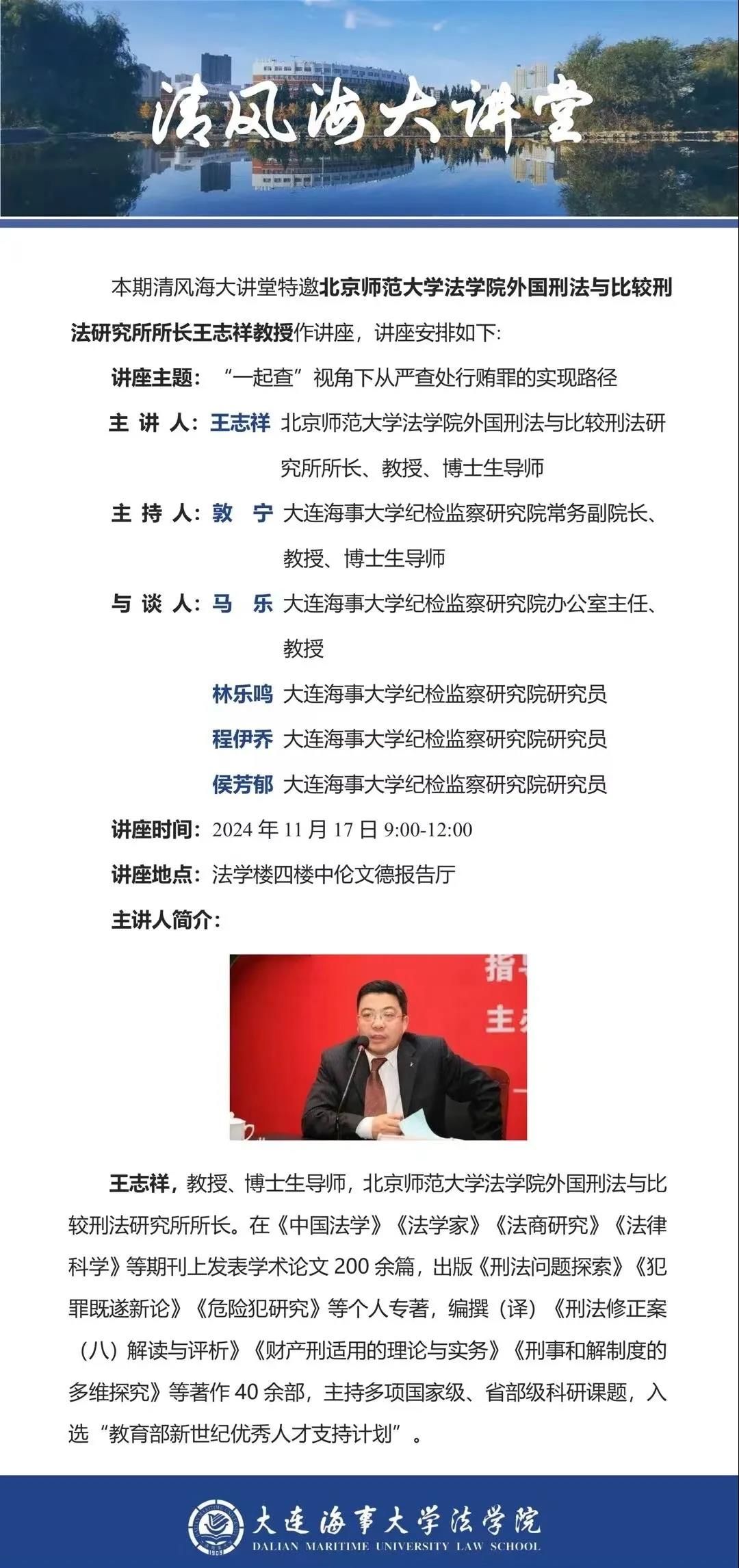 讲座通知 |【清风海大讲堂(第3期)】王志祥教授:“一起查”视角下从严查处行贿罪的实现路径