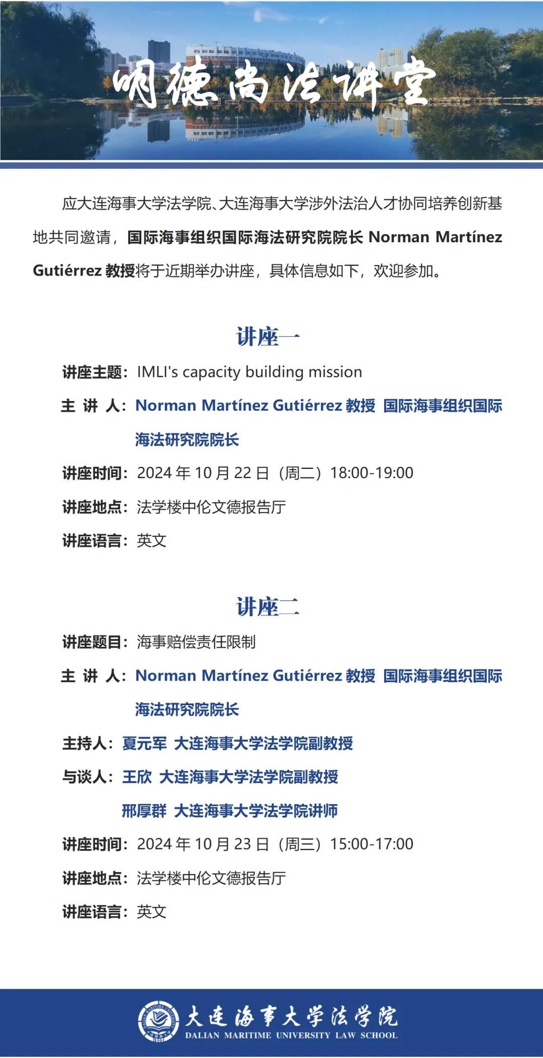 Norman Martínez Gutiérrez教授是国际海事组织国际海法研究院(IMLI)院长,于洪都拉斯国立自治大学(UNAH)攻读法律,讲授国际法和海事法超过25年。他获得IMLI的法学硕士(LLM)学位和博士(PhD)学位。自1999年以来,他一直是IMLI学院的成员,并于2019年被授予国际海事法正教授的称号。Martínez教授自2000年以来一直担任国际海事法顾问,并为各国政府起草了海事法若干领域的立法。2011年出版专著《国际海事公约中的责任限制:全球限制公约与特定责任制度之间的关系》(伦敦/纽约劳特利奇出版社)。合著、编辑了国际海事法领域的书刊,并在世界各地著名的法律期刊上以不同语言发表了多篇文章。2011年,洪都拉斯政府向他颁发了表彰证书,以表彰他对国际海事界,特别是对促进洪都拉斯共和国良好声誉的杰出贡献。他是国际海事委员会的正式成员,也是克罗地亚海事法协会的名誉会员。