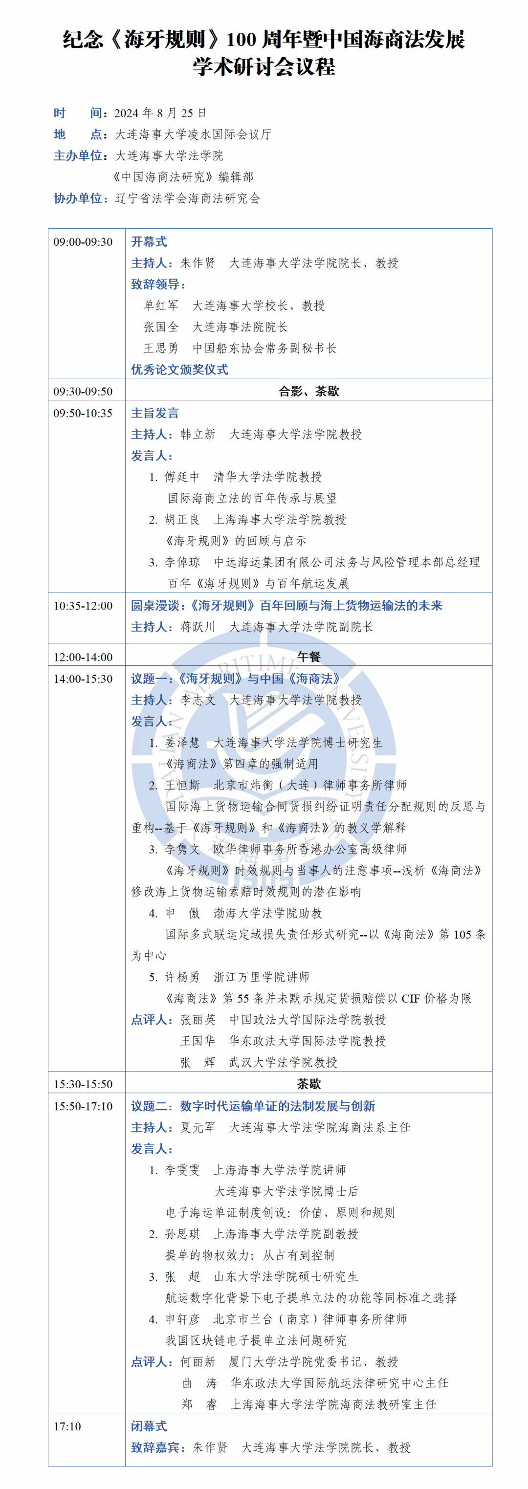 由williamhill英国、《中国海商法研究》编辑部共同主办的“纪念《海牙规则》100周年暨中国海商法发展学术研讨会”即将于2024年8月25日在williamhill威廉希尔凌水国际会议厅正式开幕!