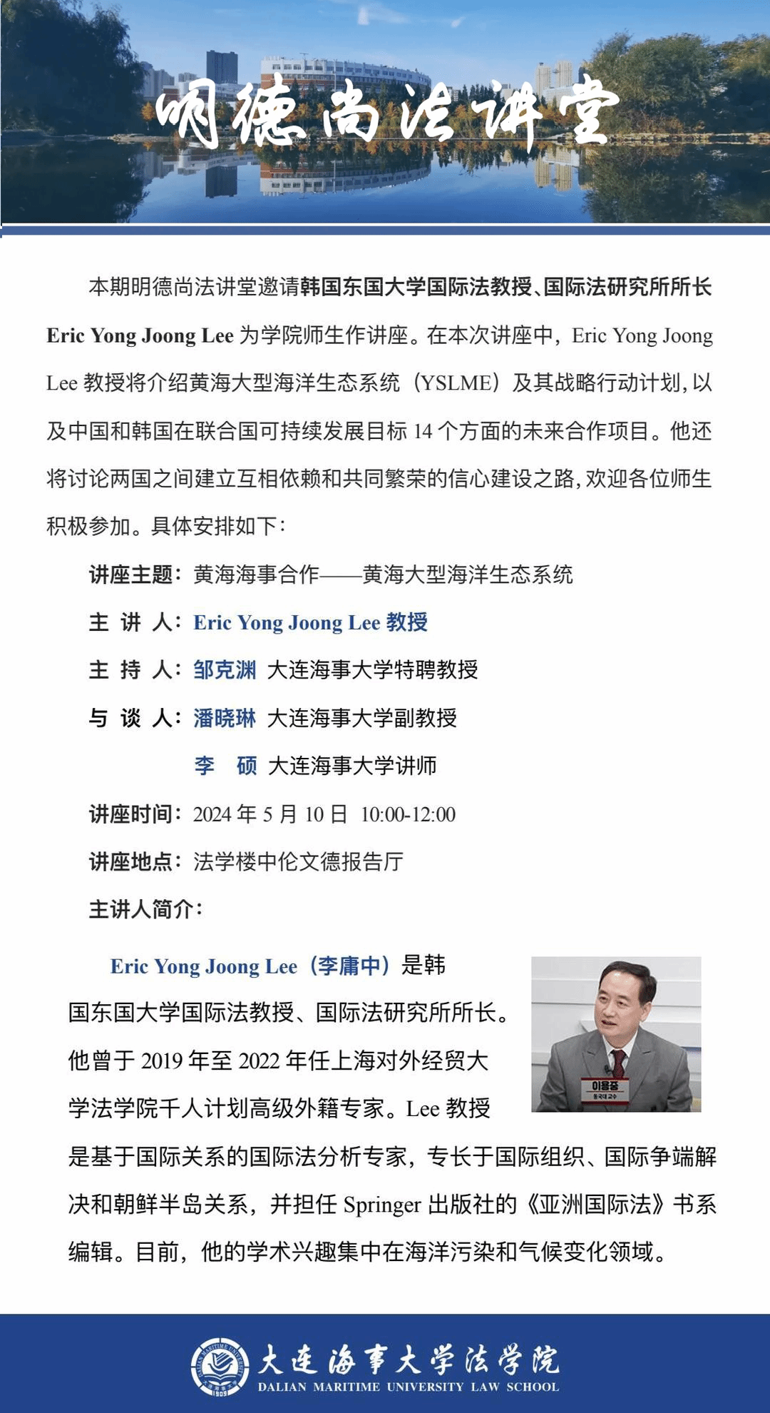 Eric Yong Joong Lee is the President of YIJUN Institute of International Law as well as Professor of International Law at Dongguk University, Seoul, Korea. He was a High & Foreign Expert of the State (PRC) 1000 Talents Program (2019-2022) at Law School of Shanghai University of International Business and Economics. Dr. Lee obtained his A.B. (political science) and M.P.A. (public policy) from the University of Washington and Seoul National University, respectively. Then, he continued to study international law at Leiden University for LL.M. and completed his Dr.iur. (Ph.D. in Law) under the supervision of Professor Peter Malanczuk at Erasmus University Rotterdam, The Netherlands. Professor Lee, an analyst of international law based on international relations, is an expert of international organization, international dispute settlement, and inter-Korean relations. He is serving as the Editor of Springer’s Book Series. His current academic interests focus on marine pollution and climate change. He may be contacted at: grotian@hotmail.com