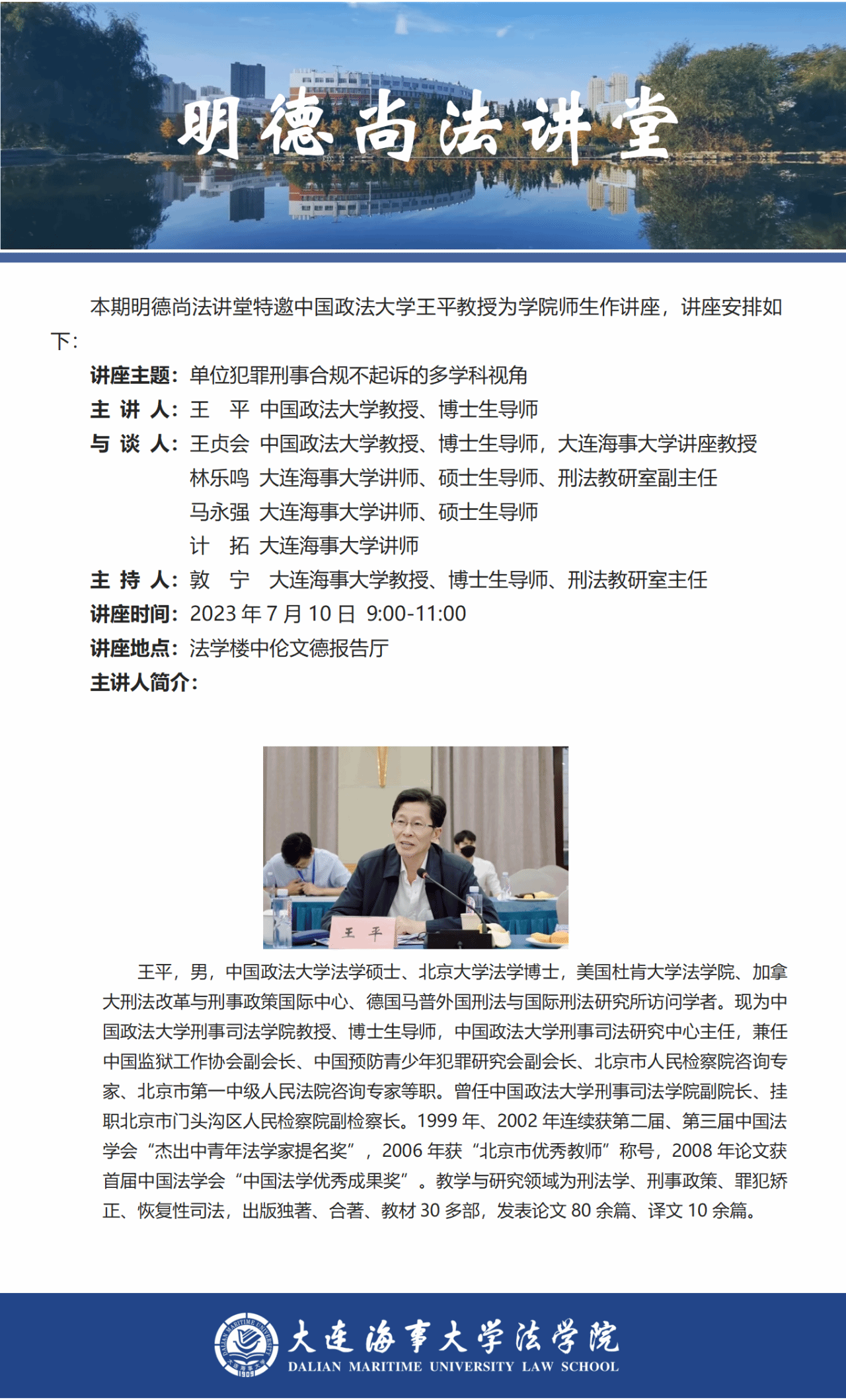 讲座通知 |【明德尚法讲堂】王平教授:单位犯罪刑事合规不起诉的多学科视角