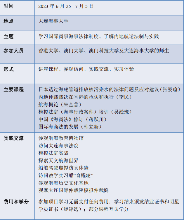 2008-2023,内港澳三地师生齐聚一堂,共同感受中华航运法律制度融汇中西之内涵,见证内地与港澳社会经济互动之繁盛,亲历航运专业人才化茧成蝶之蜕变。三地间的交流合作见证了航运市场的潮起潮落、云卷云舒;三地青年学子在相互了解中取长补短、共同成长。