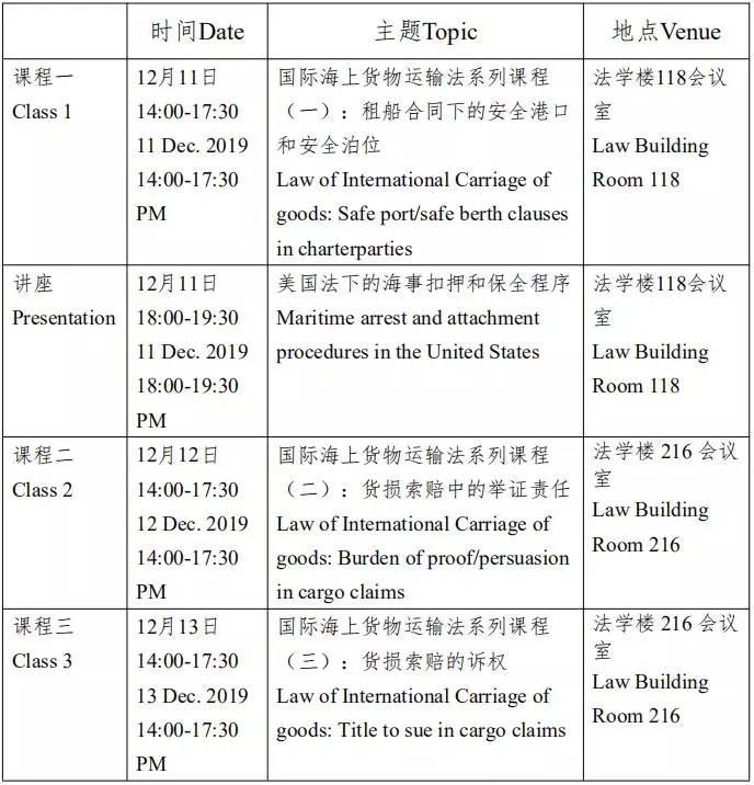 应williamhill英国邀请,美国杜兰大学海商法研究中心主任Martin Davies教授将于12月11-13日访问我校,讲授美国海商法系列课程,并为我校师生做学术讲座。欢迎关注。课程及讲座具体安排如下: