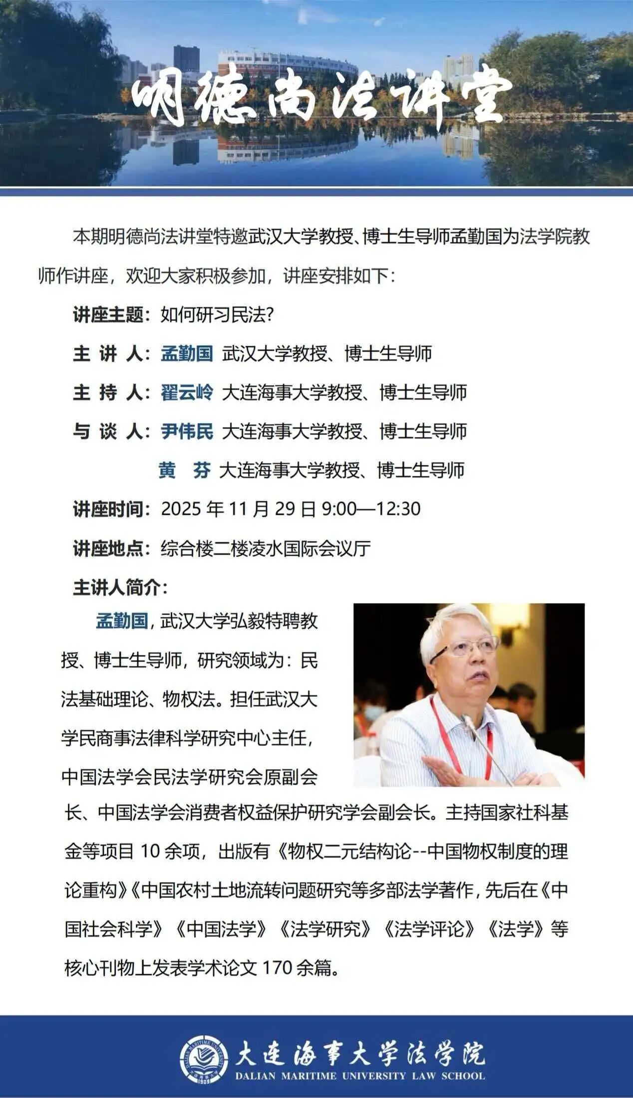 讲座通知 |【明德尚法讲堂】孟勤国教授:如何研习民法?
