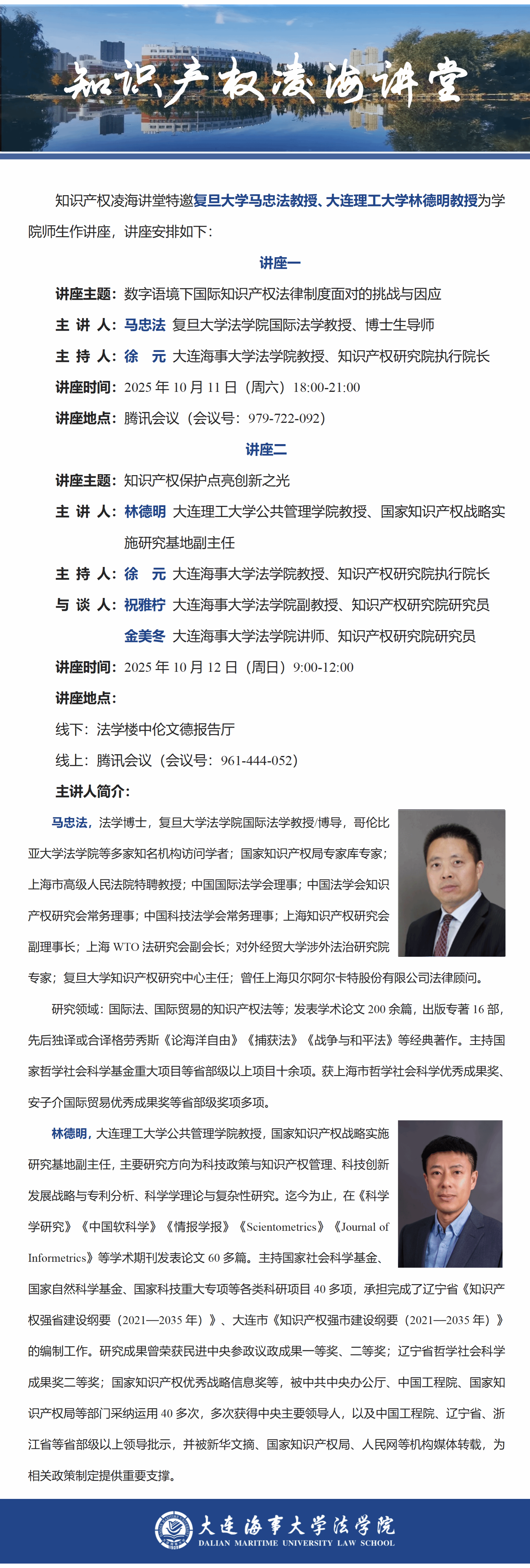 讲座通知 |【知识产权凌海讲堂】马忠法教授、林德明教授讲座通知
