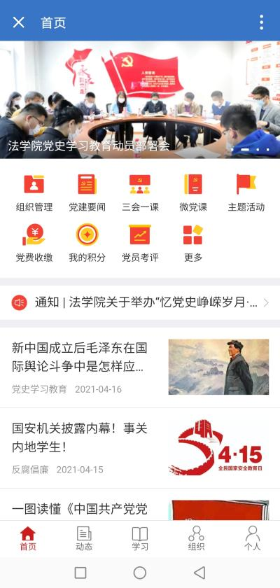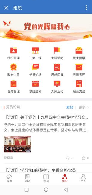 在组织栏中:点击【组织管理】【三会一课】【主题活动】【民主投票】【党员论坛】【任务管理】等专栏,可以帮助大家更加方便快捷地参加会议,参与活动。