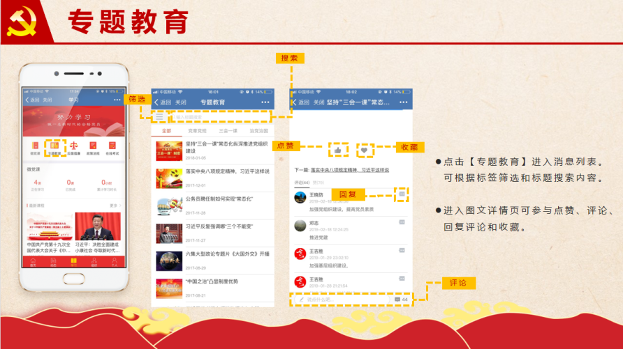 在动态栏中:大家可以点击【党建要闻】【通知公告】【党内公示】【党建相册】【支部动态】专栏,进入消息列表,点击图文详情页还可参与点赞、评论哦。