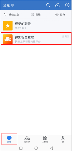 首先,打开企业微信,找到“微加智慧党建”,点击进入主页。