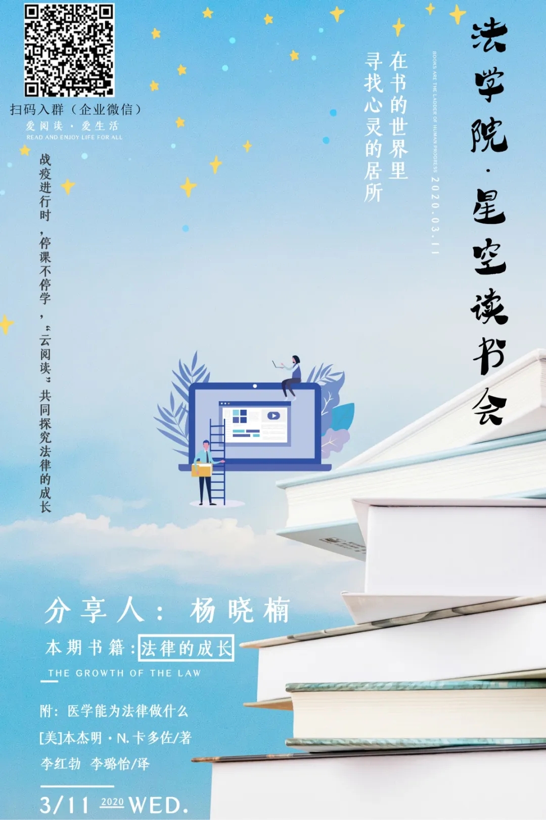 成长的道路上,总会有书香陪伴;战疫的行动中,更需要心灵的沟通。在这样一个特殊的时期,我们虽然不能相聚校园,但书籍仍将成为我们心灵沟通的桥梁,3月11日(周三)下午1:30-3:00,让我们相聚“云分享”,共同开启williamhill英国“星空”读书会首期读书“云分享”——解读《法律的成长》,与杨晓楠老师来一场“云邂逅”。
