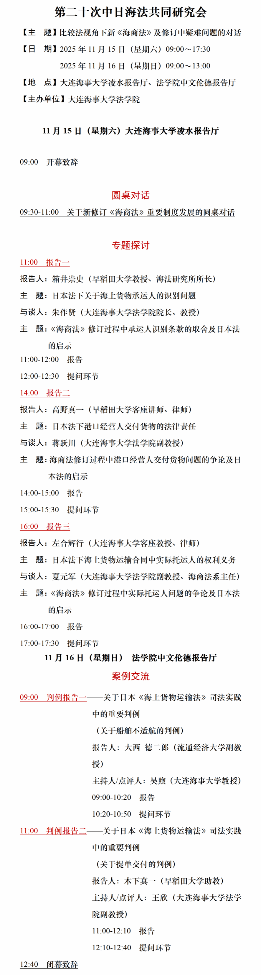 在《中华人民共和国海商法》(以下简称《海商法》)修订刚完成之际,第20次中日海法共同研究会将以“比较法视角下新《海商法》及修订中疑难问题的对话”为主题,举办《海商法》完成修订后的首次国际性质研讨会,旨在宣介新《海商法》的重要发展并进行比较法的深入交流。其中,“圆桌对话”环节由直接参与《海商法》修订研究工作的中国专家教授分章对新法的重要变化进行要义解读,随后由日本专家从比较法的视角展开学术对话。“专题探讨”环节则围绕《海商法》修订中的重点争议问题进行比较法探讨,包括提单承运人识别、港口经营人交付货物义务、实际托运人的权利义务等。“案例交流”环节将沟通日本司法实践中的重要判例。