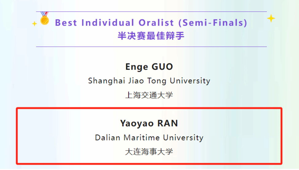 选手冉尧垚荣获半决赛“最佳辩手”