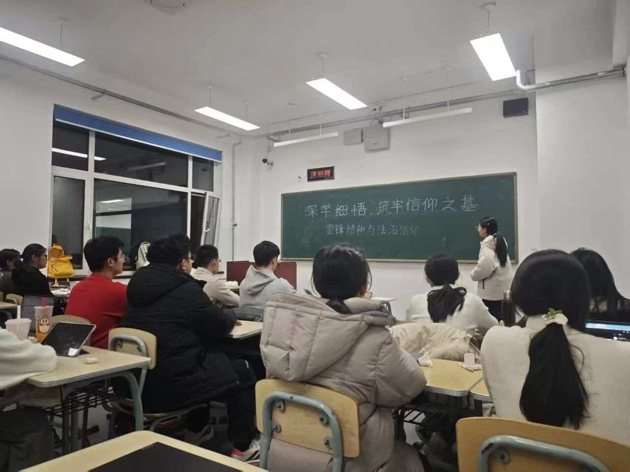 各团支部依托“三会一课”、主题班会,组织学习党的二十大精神,围绕“雷锋精神与法律人时代使命”开展专题学习。结合卫国戍边英雄、基层法治先锋等先进事迹,特别是“金城龙”精神遗产,引导学生深度探寻雷锋精神与法治信仰的时代内涵。